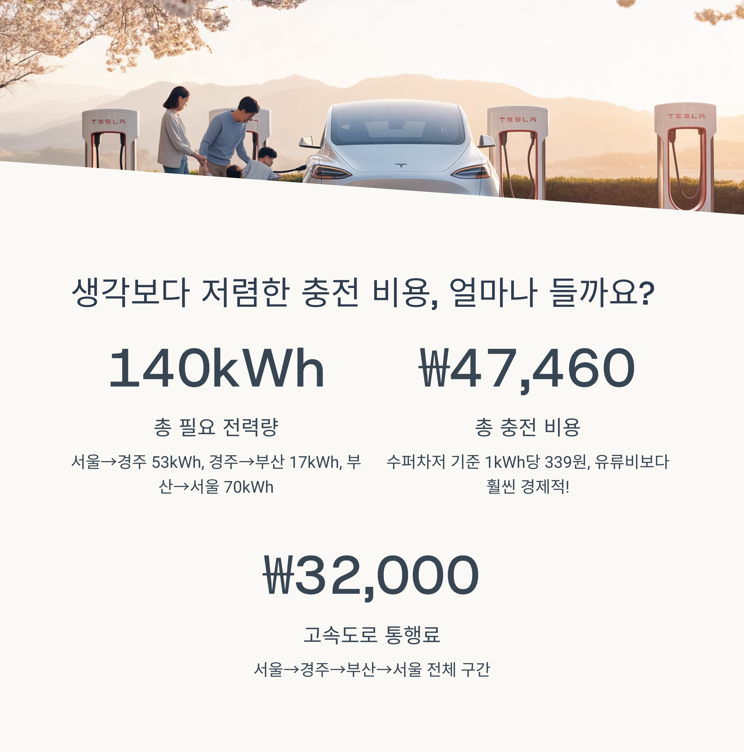 | 충전비 | 총 140kWh 수퍼차저 기준 | ₩47,460 |