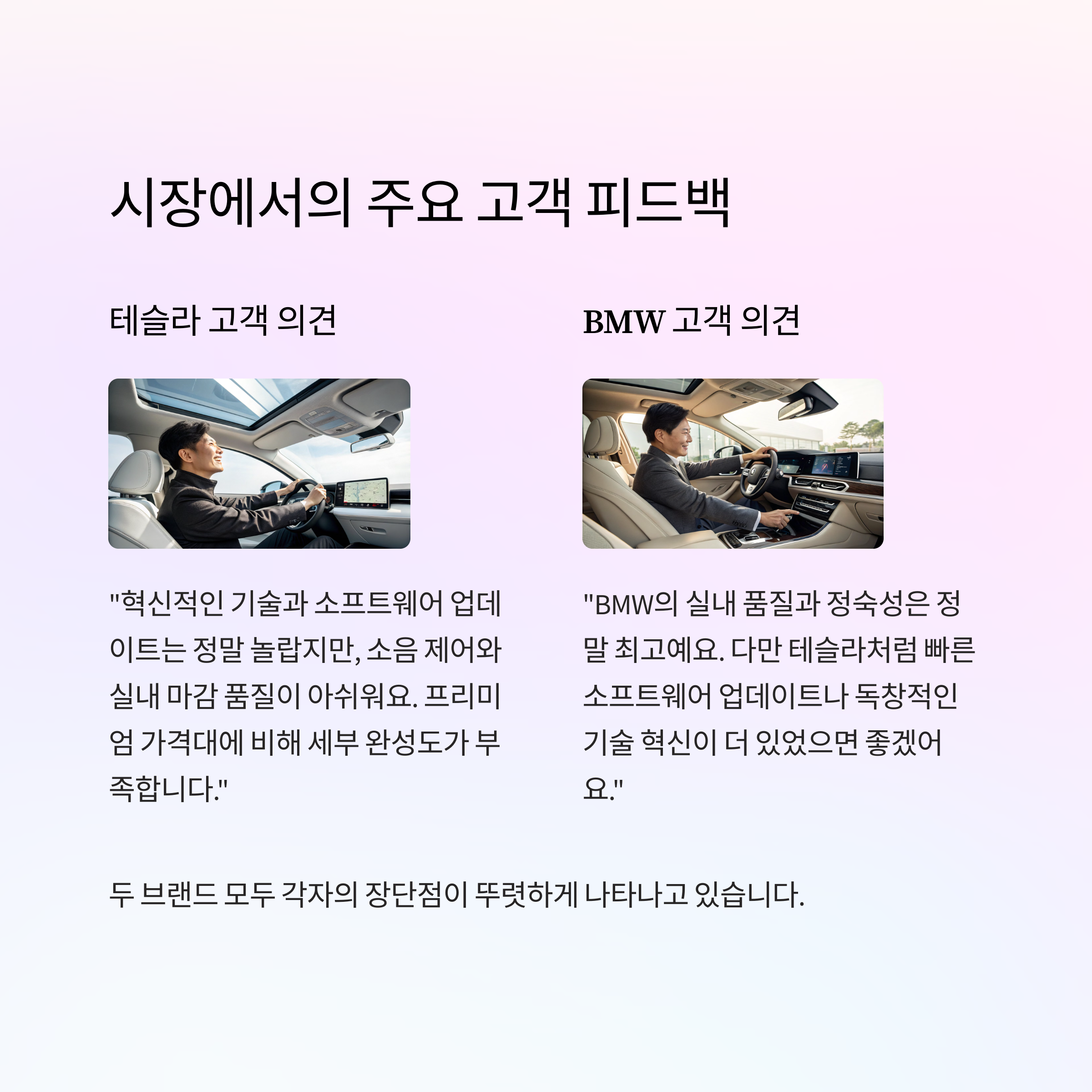 결론적으로, 단기적인 인기는 테슬라가 얻을 수 있지만, 지속적인 신뢰와 만족도를 구축하는 데는 BMW가 앞서 있다고 볼 수 있다.