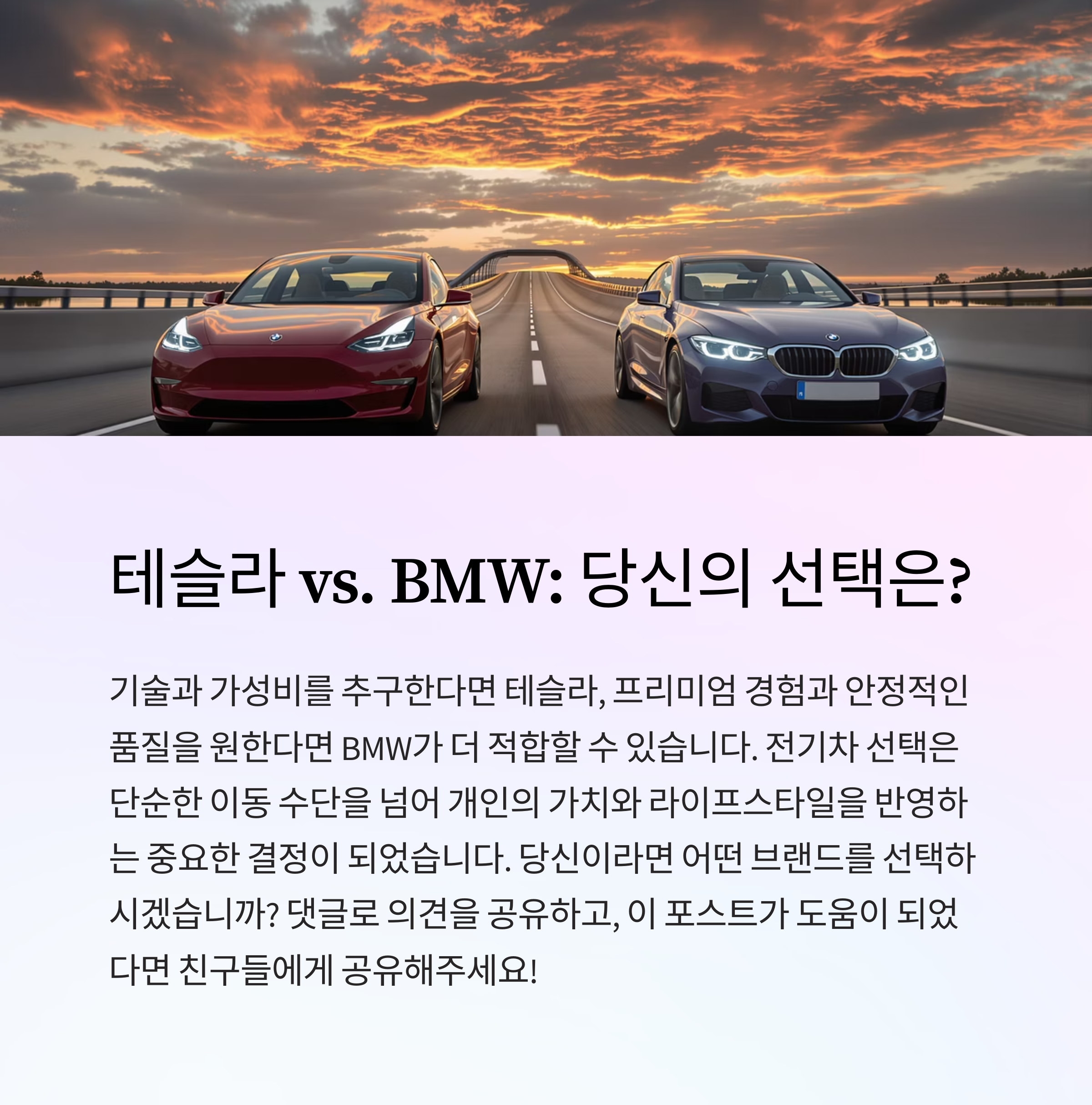 결론적으로, 단기적인 인기는 테슬라가 얻을 수 있지만, 지속적인 신뢰와 만족도를 구축하는 데는 BMW가 앞서 있다고 볼 수 있다.