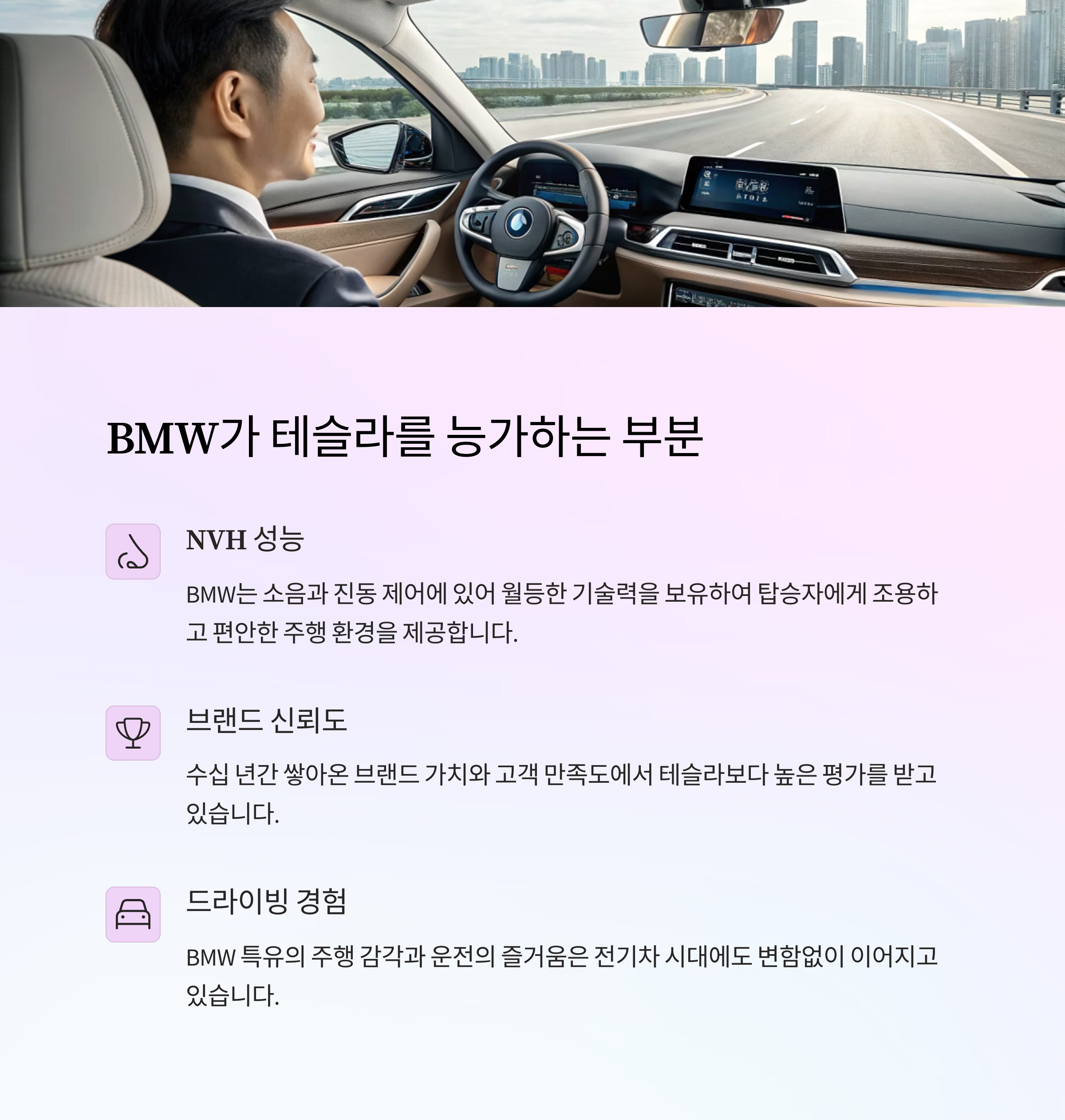 운전의 재미, 실내 완성도, 충전 인프라, 서비스 네트워크, NVH 성능 등 다양한 요소에서 BMW는 프리미엄 브랜드로서의 위상을 굳건히 지키고 있다. 테슬라가 기술 중심의 혁신에 강점을 가지고 있다면, BMW는 ‘전체적인 자동차 경험’에서 앞서 있다고 할 수 있다.