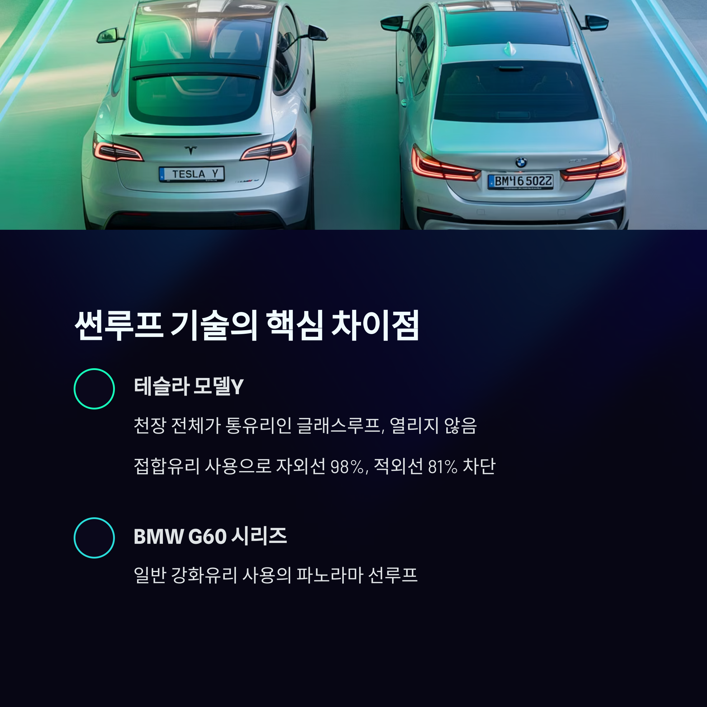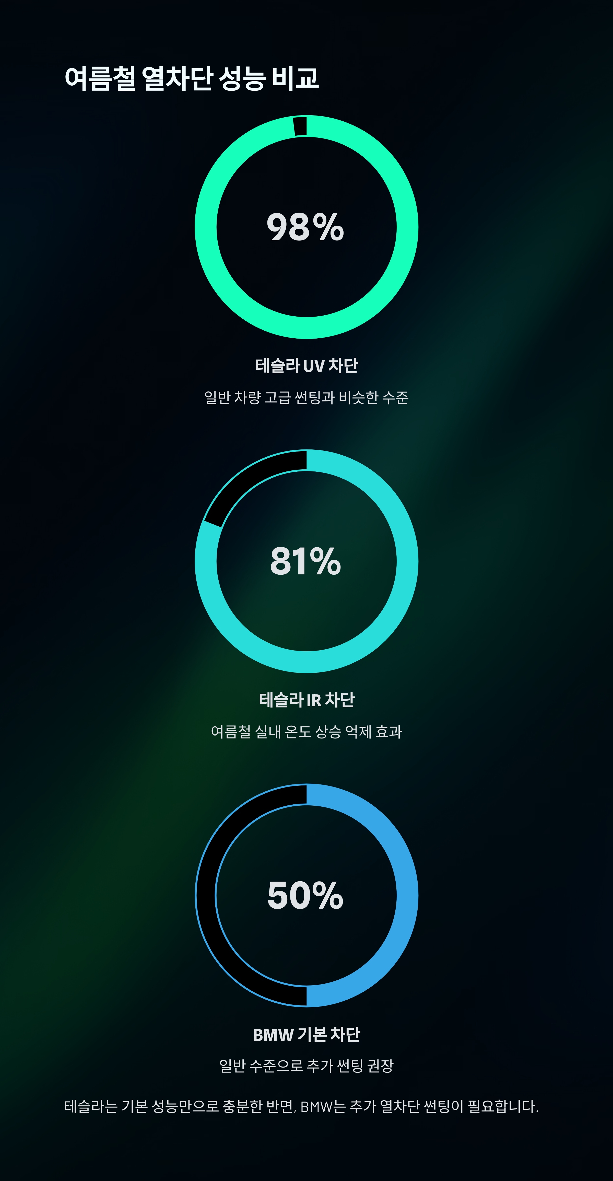 요즘 전기차와 수입차의 대형 썬루프가 인기죠? 하지만 여름철 뜨거운 햇볕과 만나면 차 안이 사우나가 되는 경험, 다들 있으실 겁니다. 특히 테슬라 모델Y는 UV 98%, IR 81% 차단 성능으로 썬팅이 꼭 필요하지 않다는 놀라운 사실! BMW 신형 5시리즈(G60)와 비교해서 어떤 차가 더 실용적인지 알아보겠습니다.