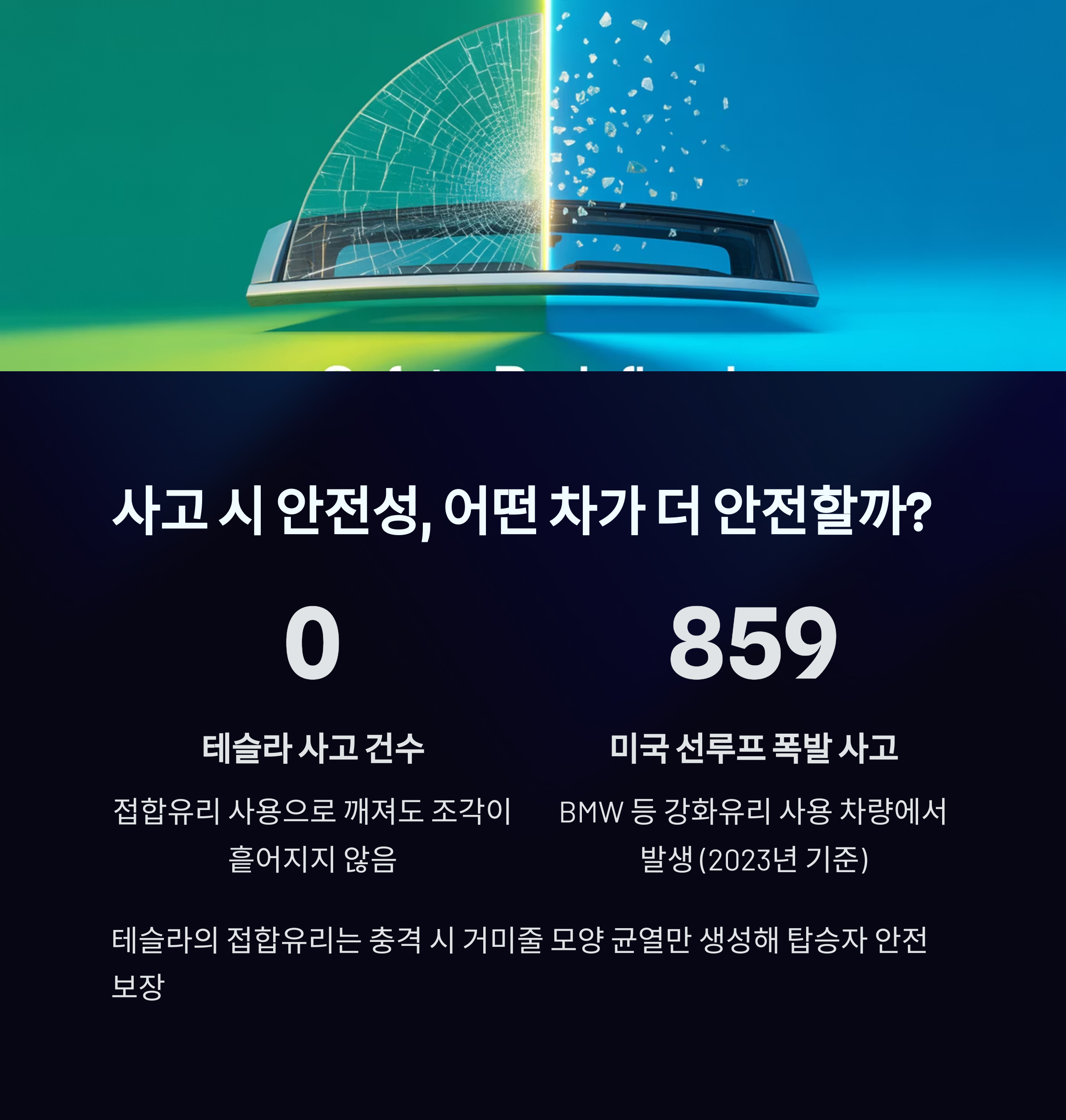 2023년 미국에서만 선루프 폭발 사고가 859건 발생했습니다. 35개 브랜드 208개 모델에서 사고가 일어났는데, 유리 종류에 따라 안전성이 크게 달랐어요.
