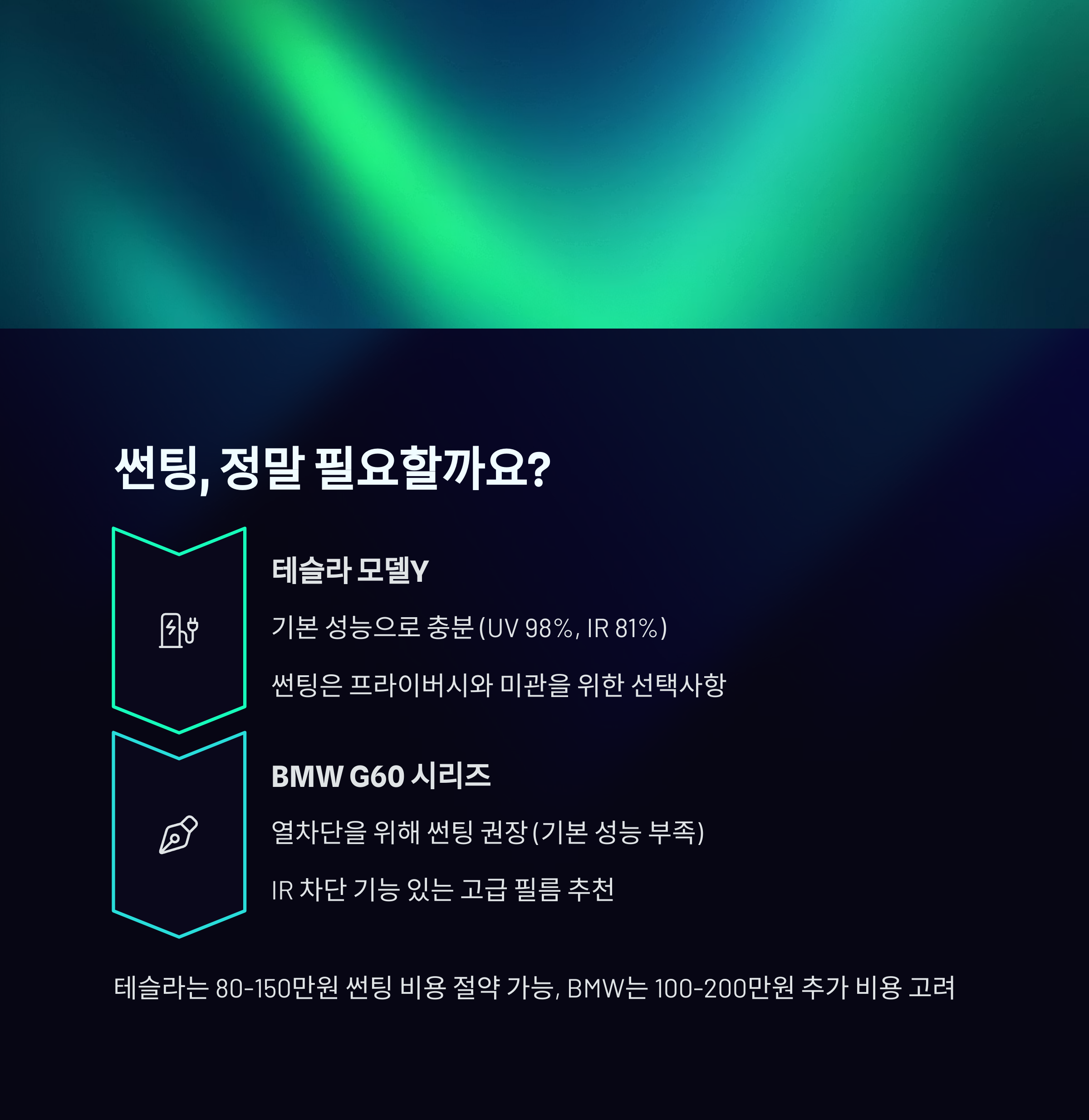 | 썬팅 필요도 | 선택사항 (기본 성능 충분) | 권장 (열차단 효과) |