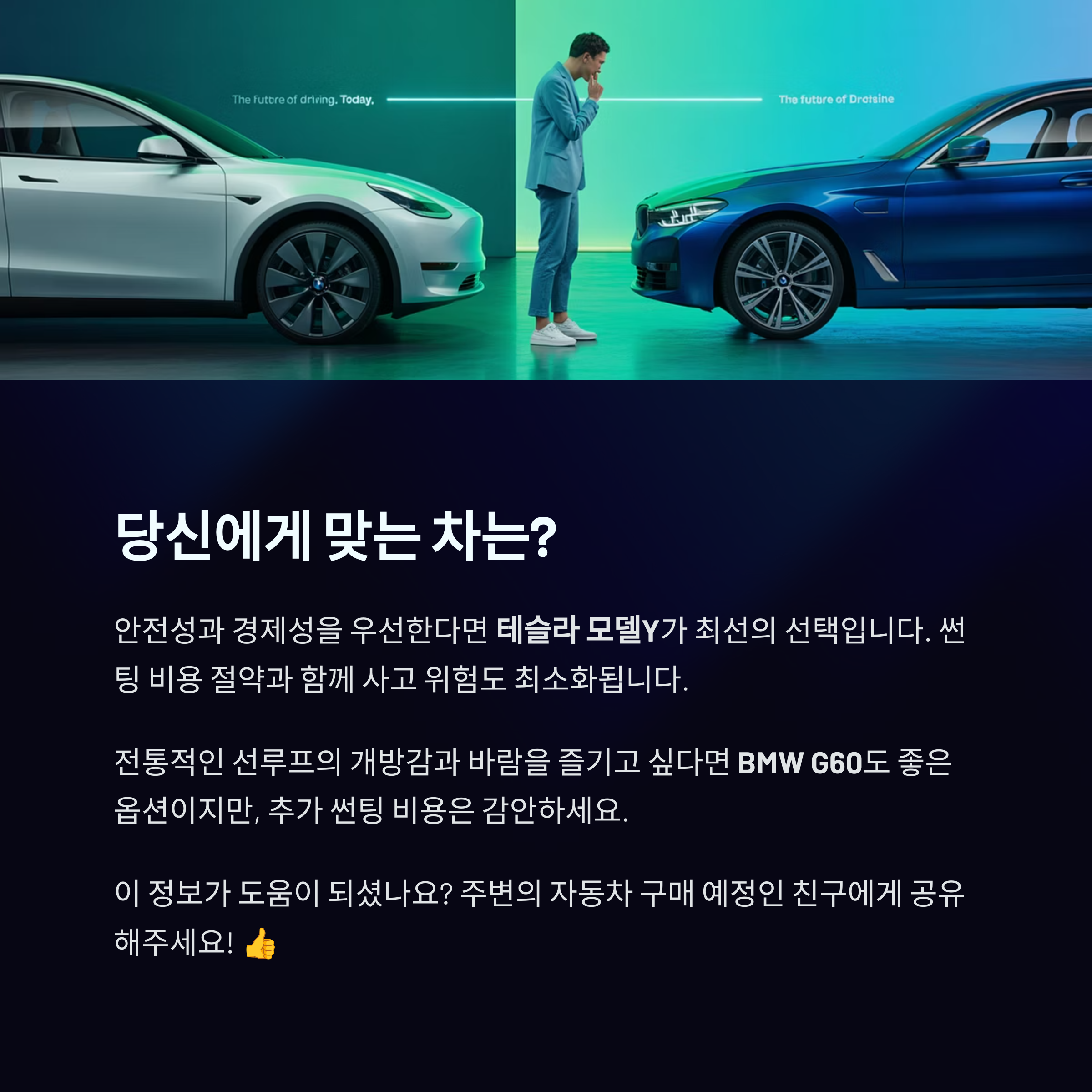 안전성과 경제성을 최우선으로 한다면 테슬라 모델Y가 확실한 선택입니다. UV 98%, IR 81% 차단 성능으로 썬팅 없이도 충분하고, 사고 위험도 거의 없어요. 하지만 전통적인 선루프의 매력을 원한다면 BMW G60 시리즈도 좋은 선택이에요. 다만 추가 썬팅 비용은 감안해 주셔야 합니다!