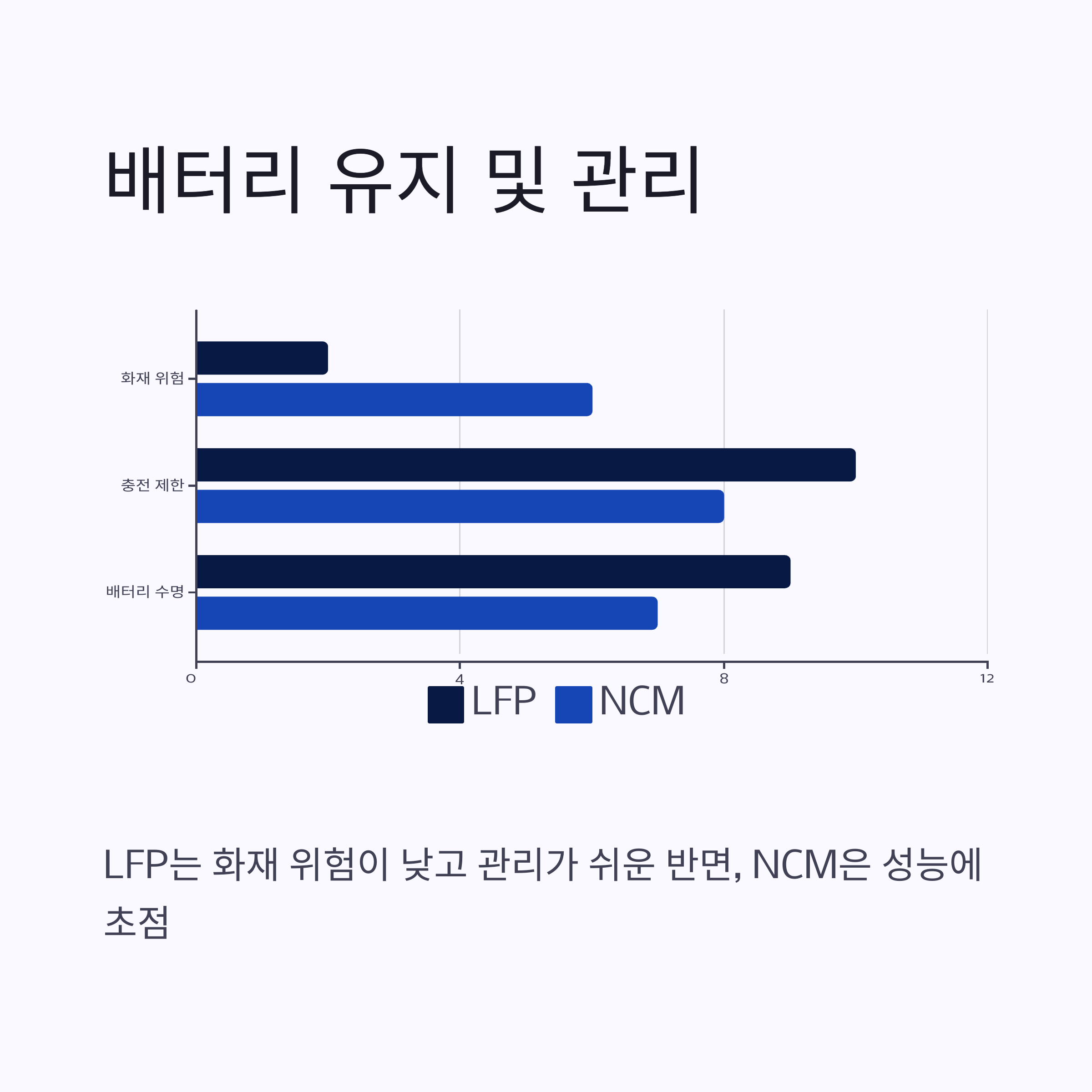 NCM은 저온 성능이 뛰어나 겨울철에도 주행 효율이 비교적 안정적입니다.
