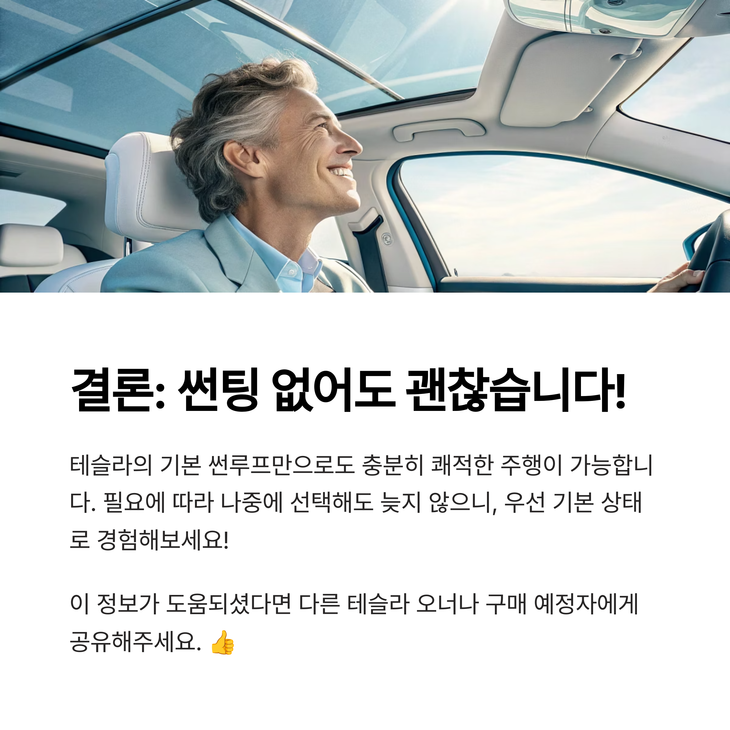 이 글을 통해 테슬라 썬루프 썬팅에 대한 고민이 조금은 정리되셨길 바랍니다. 선택은 결국 본인의 라이프스타일과 운전 습관에 따라 달라질 수 있어요. 저는 1년간 썬루프 썬팅 없이도 정말 만족하며 잘 타고 다녔고요, 때론 이렇게 단순한 선택이 스트레스를 줄이기도 합니다. 여러분의 경험이나 궁금한 점도 댓글로 나눠주세요! 서로의 정보가 큰 도움이 될 수 있거든요. 다음에도 테슬라 생활 팁 가득한 글로 찾아올게요. 🌟