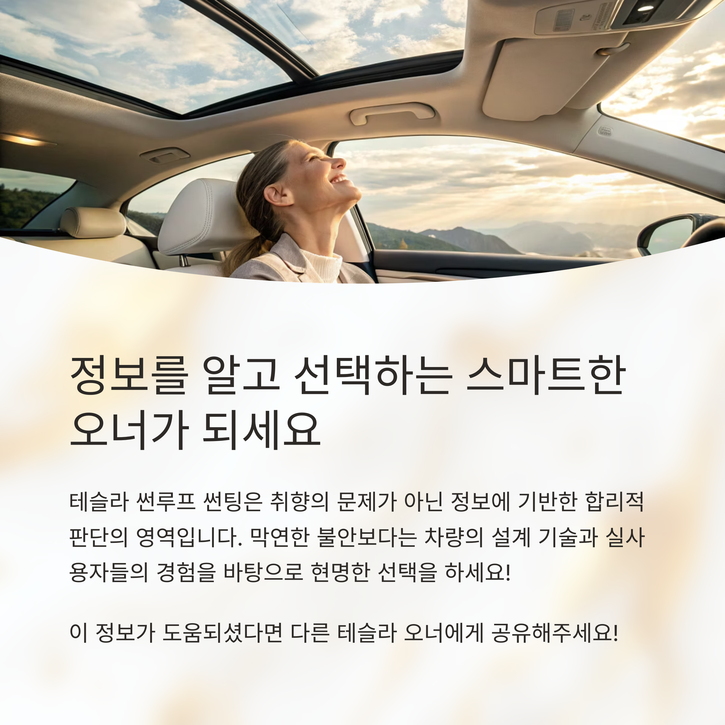 테슬라 오너 사이에서 끊이지 않는 글라스루프 썬팅 논쟁은 결국 사용자의 라이프스타일과 정보 이해도에 달려 있습니다.