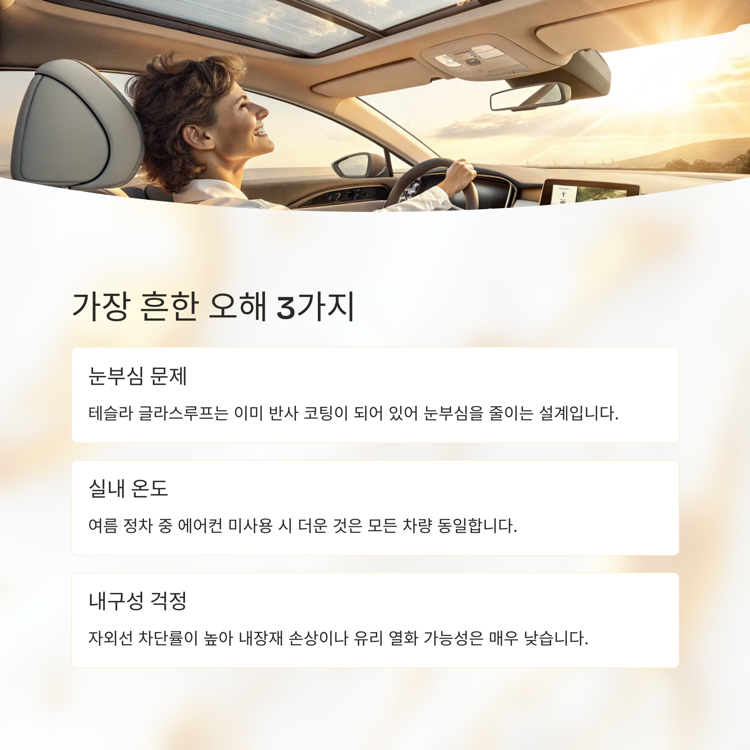 이미 고성능 코팅이 적용된 테슬라 글라스루프는 자외선과 열 차단 능력 면에서 일반 차량용 썬팅보다 앞서 있으며, '무조건 해야 한다'는 인식 자체가 오해일 수 있습니다.