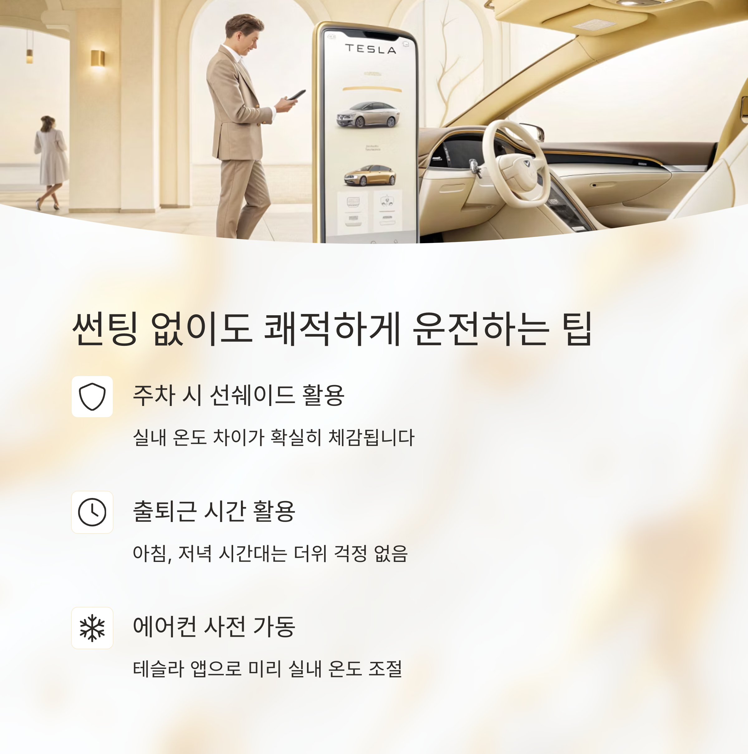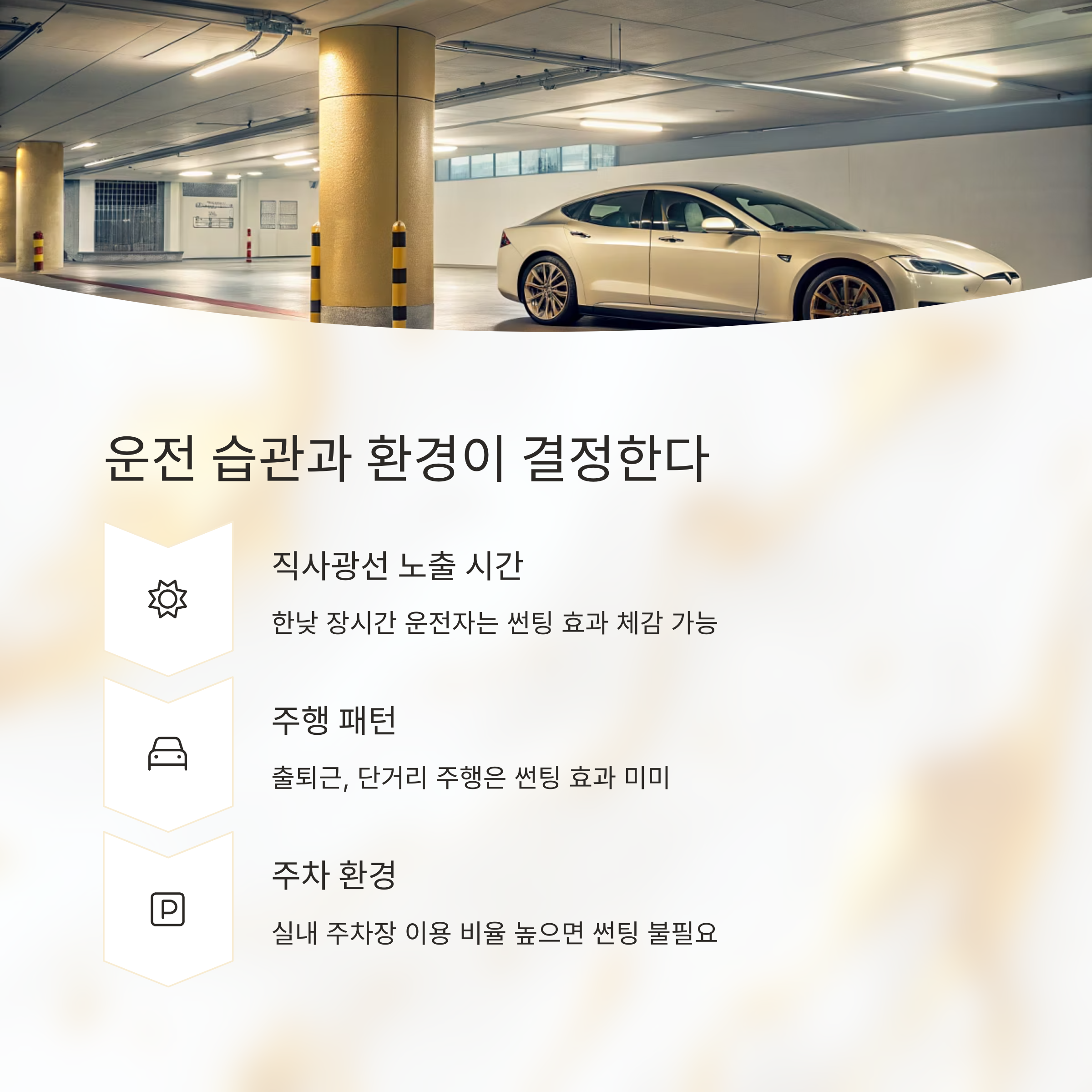 하지만 대부분의 테슬라 오너는 출퇴근, 단거리 주행, 주차장 이용 비율이 높아 썬팅 효과를 체감하기 어렵습니다.