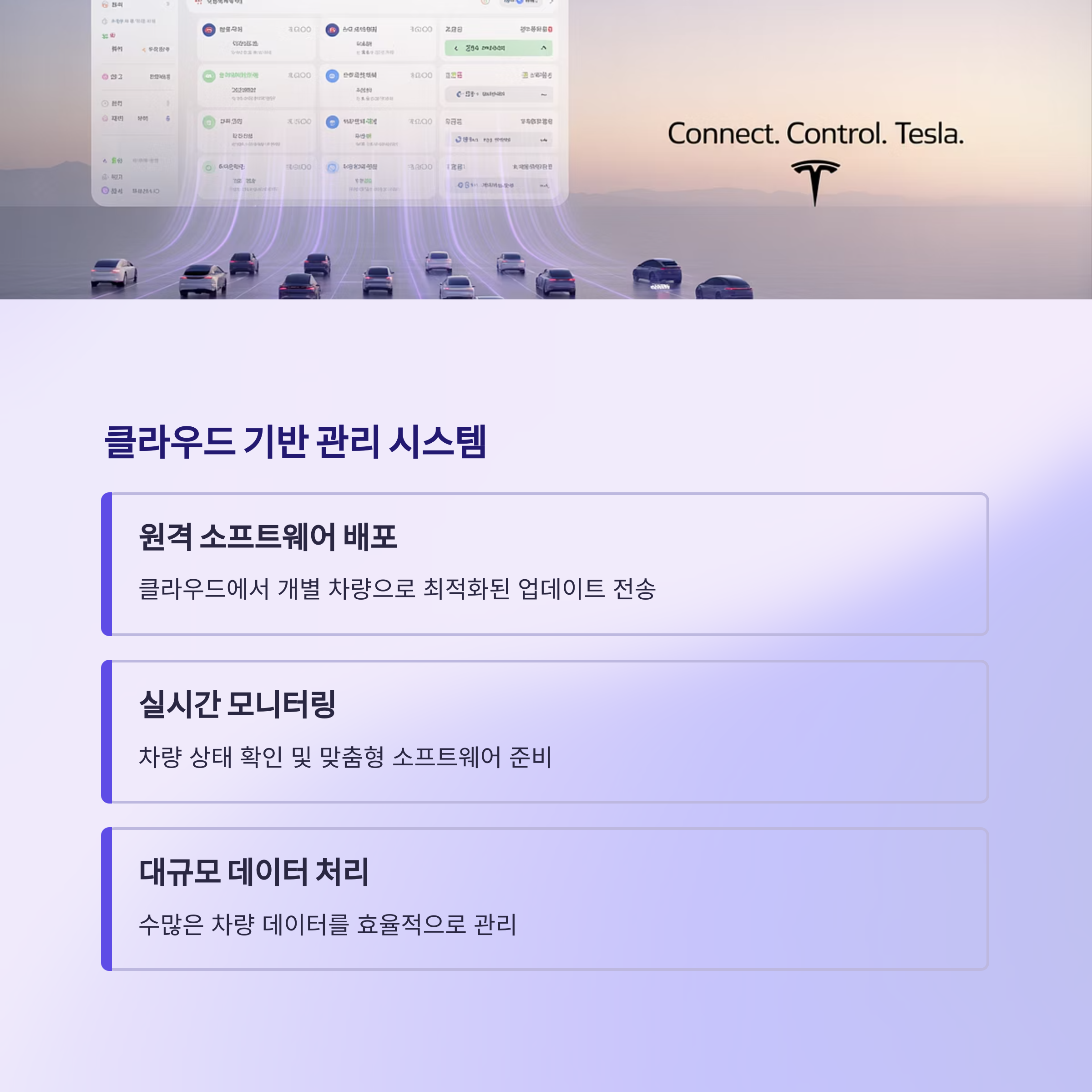 테슬라 차량은 클라우드와 연동되어 원격으로 데이터를 주고받습니다. 이 클라우드 기반 시스템 덕분에 테슬라는 대규모 데이터 처리와 소프트웨어 배포를 효율적으로 관리할 수 있으며, 사용자 차량에 맞는 최적의 업데이트를 제공합니다. 이를 통해 차량 소유자는 언제든지 최신 소프트웨어를 손쉽게 받을 수 있습니다.