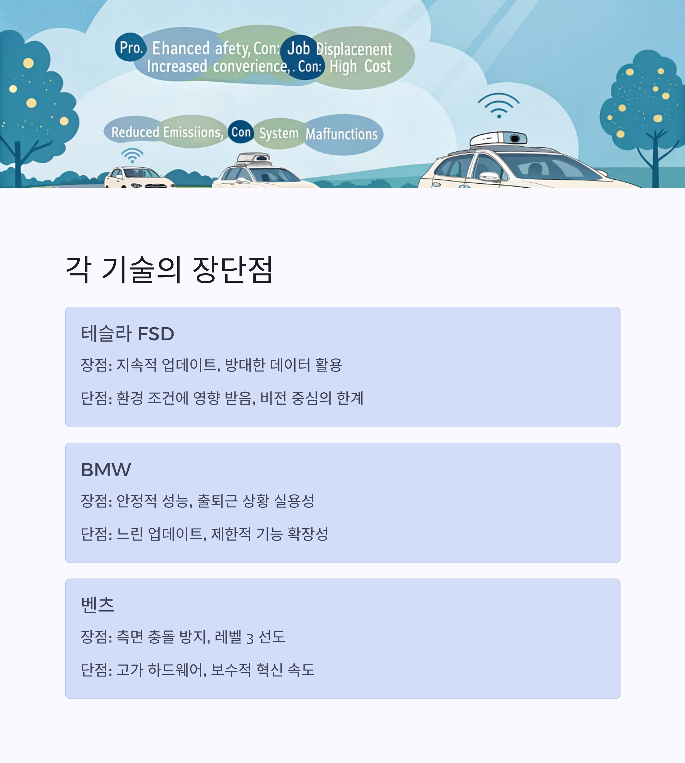 - 데이터의 중요성: 테슬라의 방대한 실사용 데이터 수집 전략이 장기적으로 AI 성능 향상에 유리할 수 있으나, BMW와 벤츠의 정밀 센서 기반 접근 방식도 안정성 측면에서 중요한 가치를 지닙니다.
