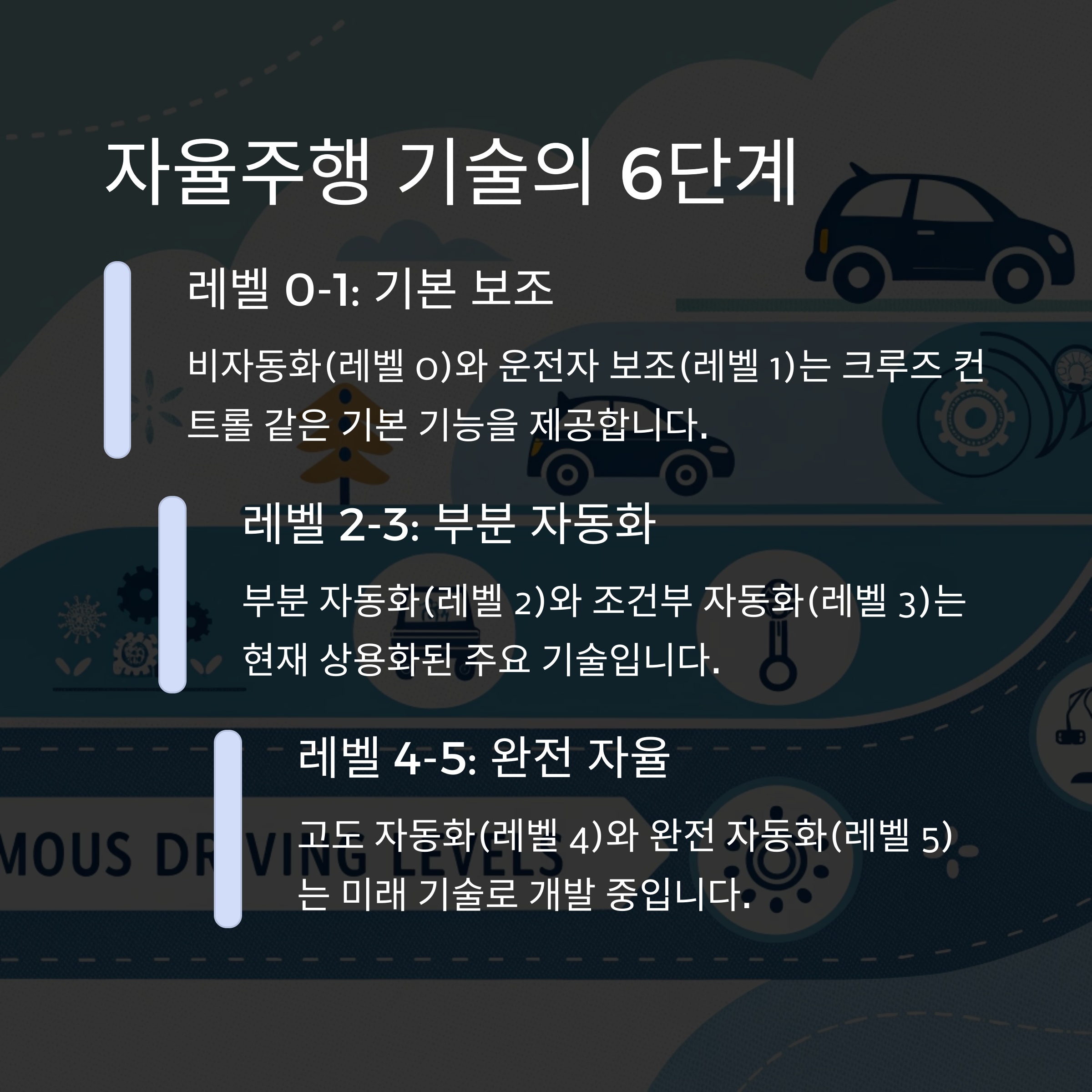 | 레벨 2 | 부분 자동화 | 조향과 가속/감속 모두 자동화되지만 운전자가 계속 모니터링 필요 |