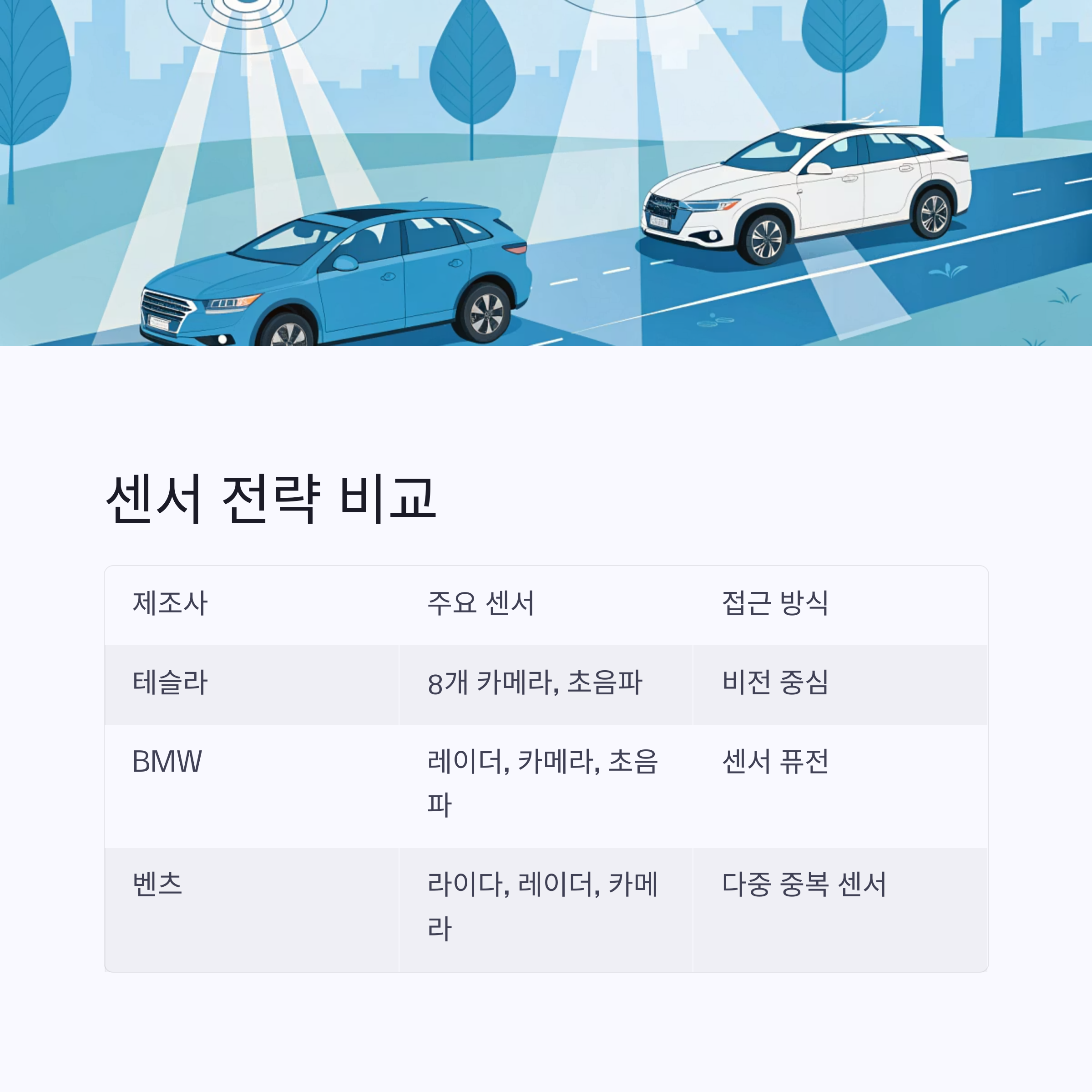 각 제조사는 자율주행을 위해 서로 다른 센서 전략을 채택하고 있습니다.