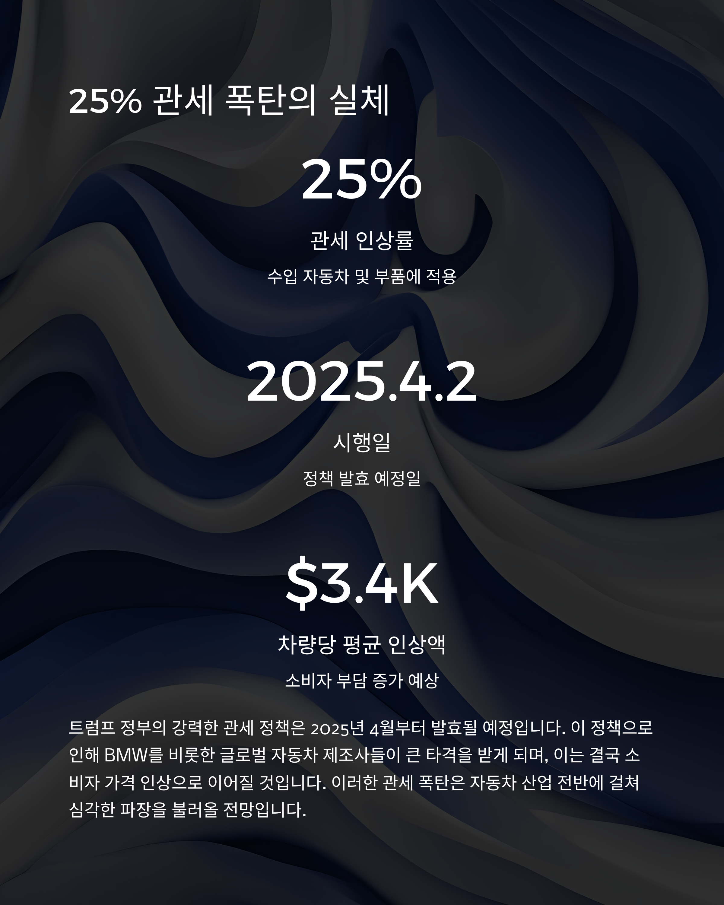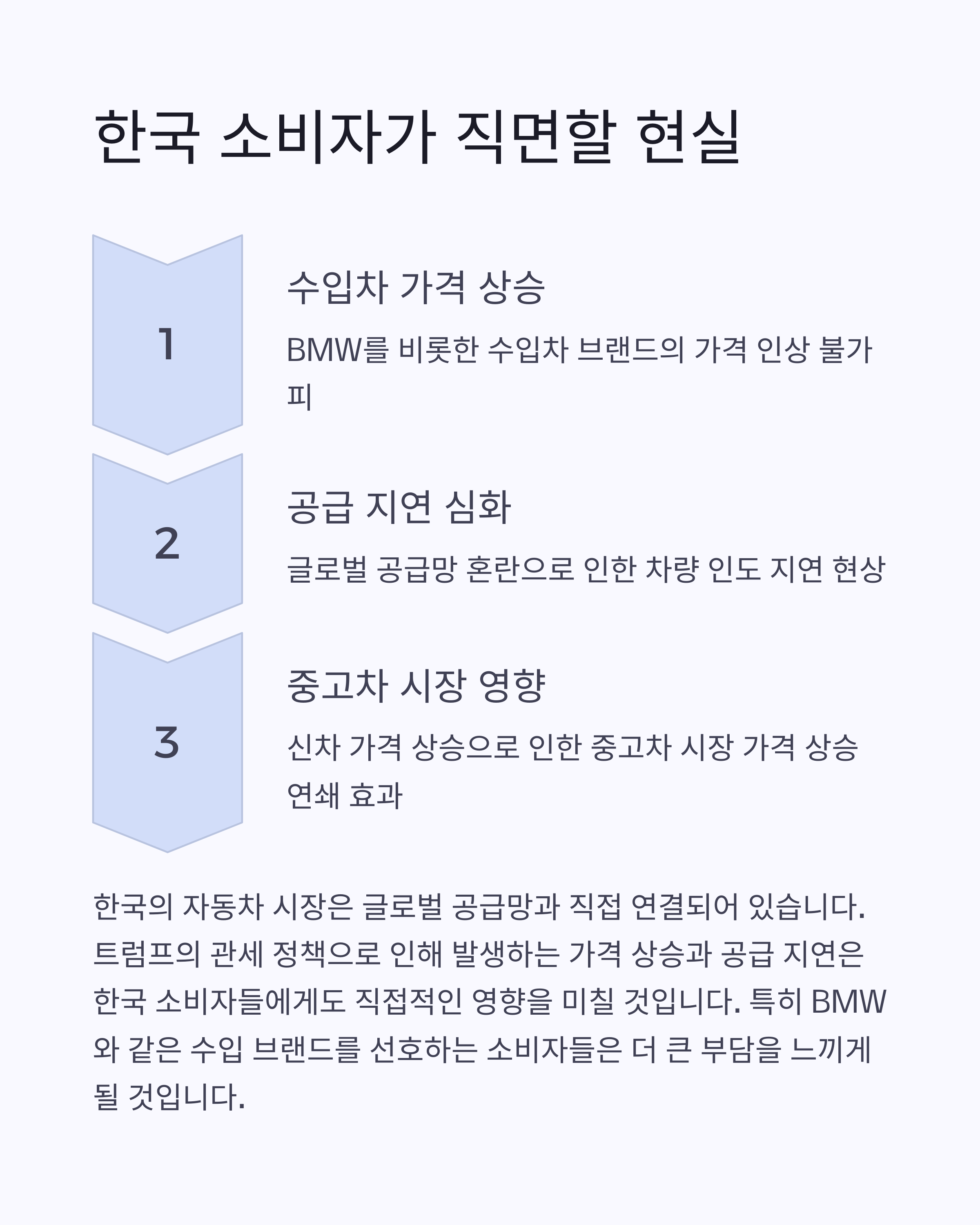 트럼프 관세 인상이라는 정책 변화는 BMW 가격 인상이라는 결과를 통해 한국 소비자에게도 직접적인 영향을 주었으며, 이 두 현상은 결코 무관하다고 할 수 없습니다.