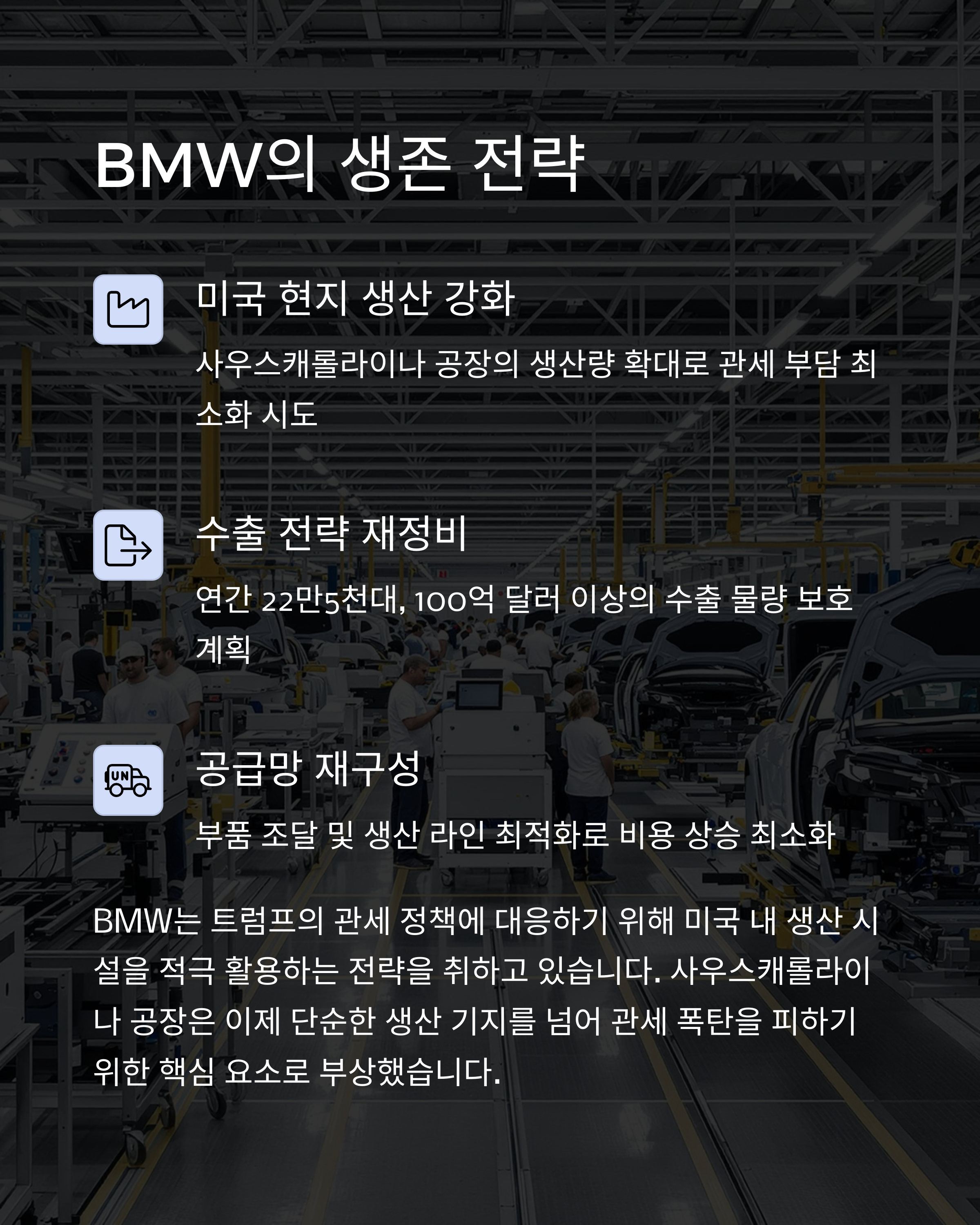 트럼프 관세 정책 이후 BMW는 일부 생산라인을 미국 외 지역으로 분산하는 전략을 채택했습니다.