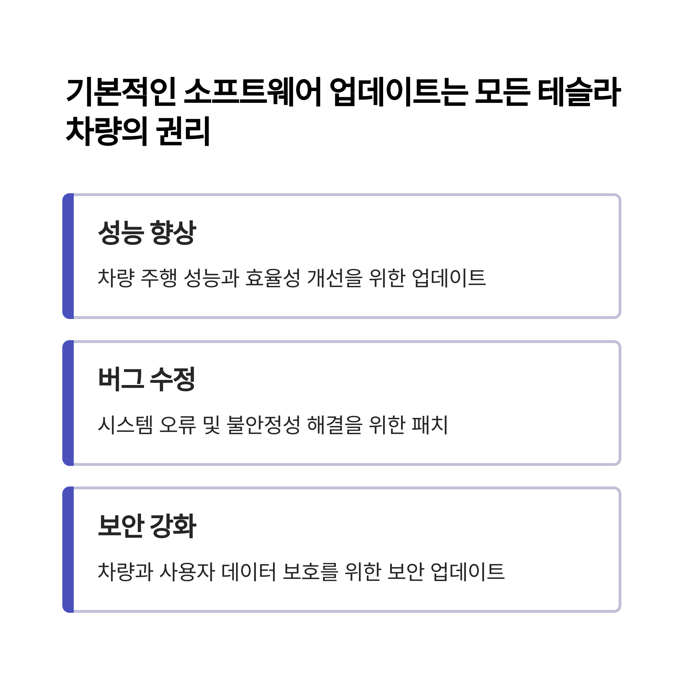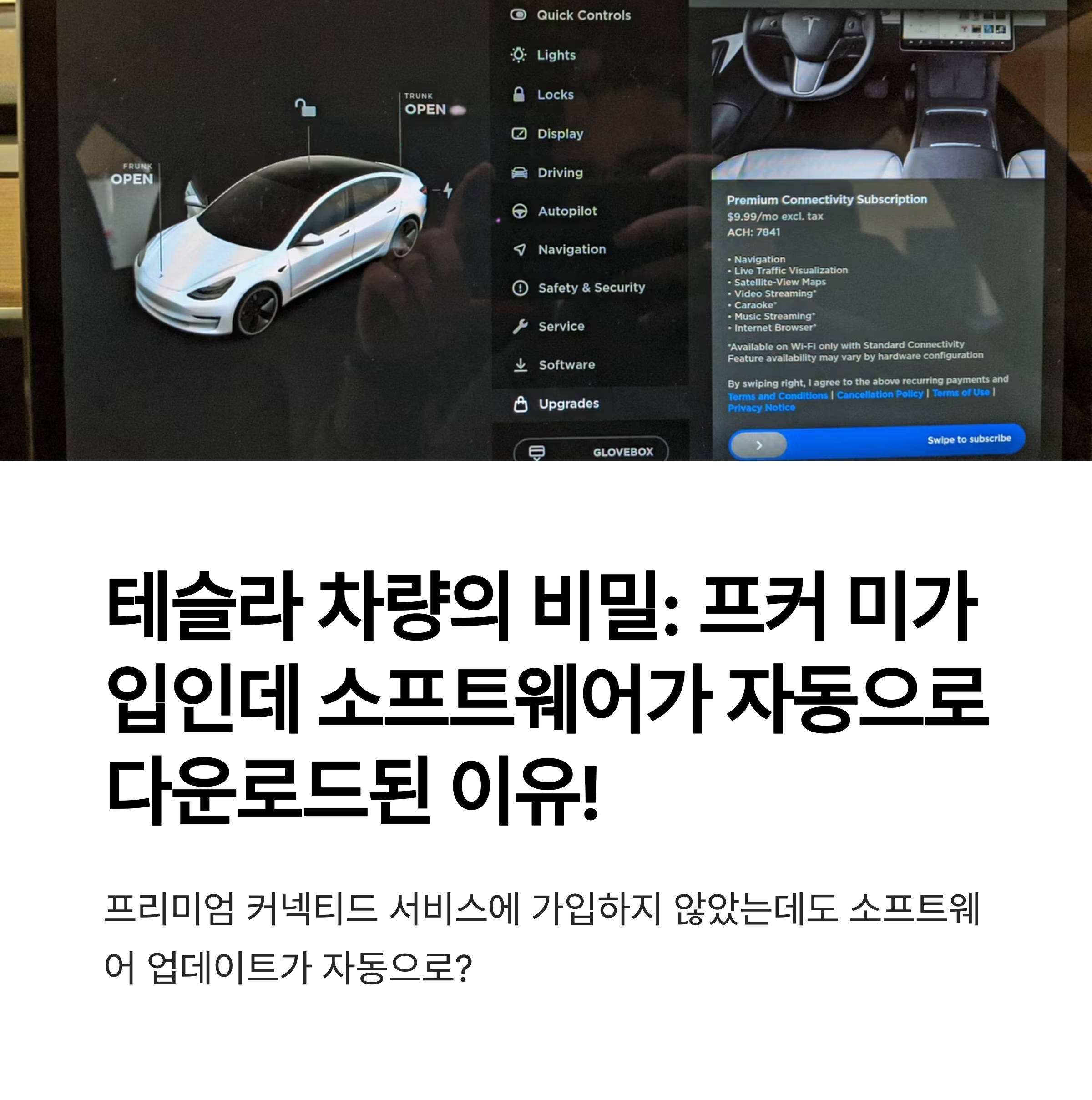 왜 테슬라 차량은 프커 미가입자도 소프트웨어 업데이트를 자동으로 받는 걸까요?테슬라 차량은 대부분의 기능과 시스템을 소프트웨어 업데이트를 통해 개선합니다. 프리미엄 커넥티비티 미가