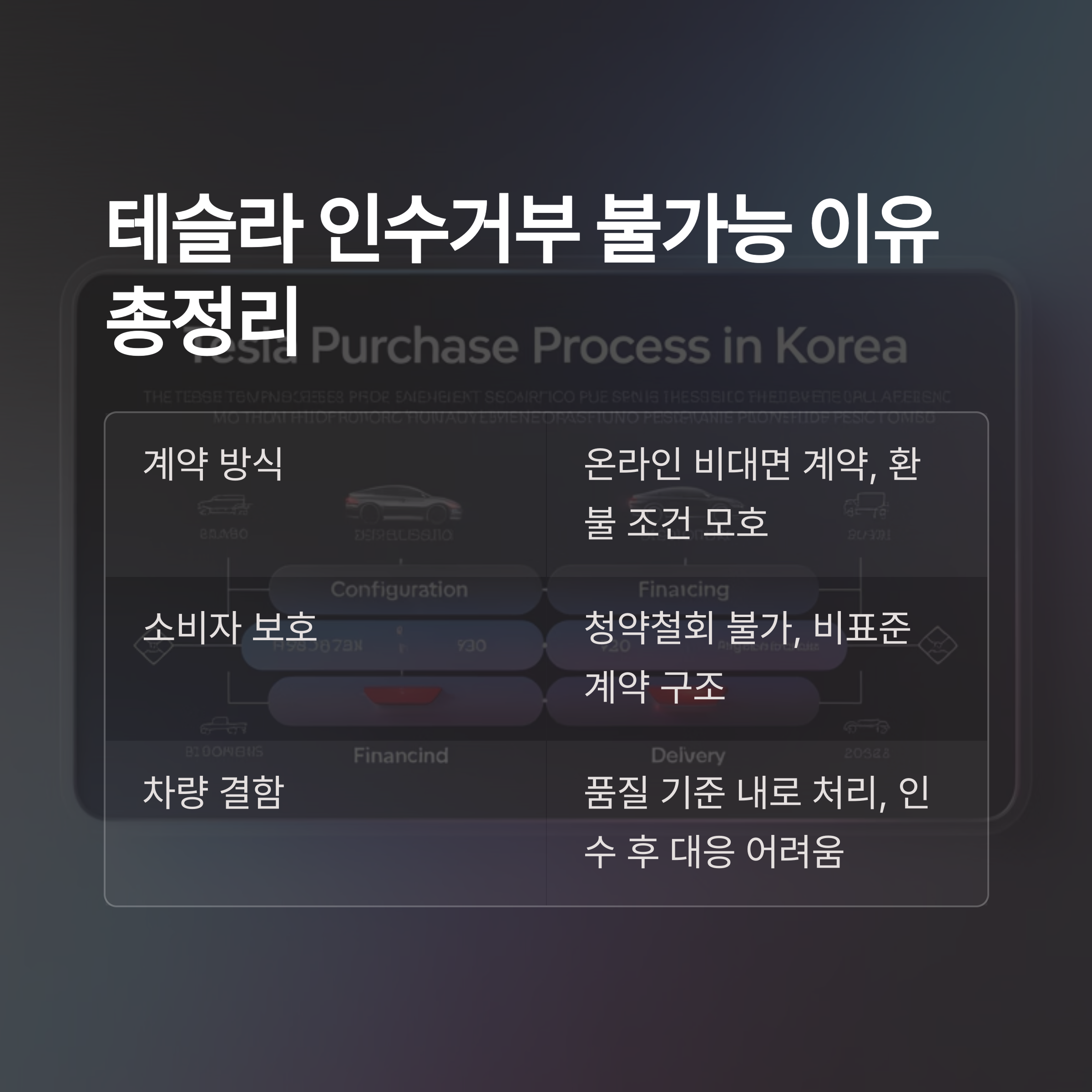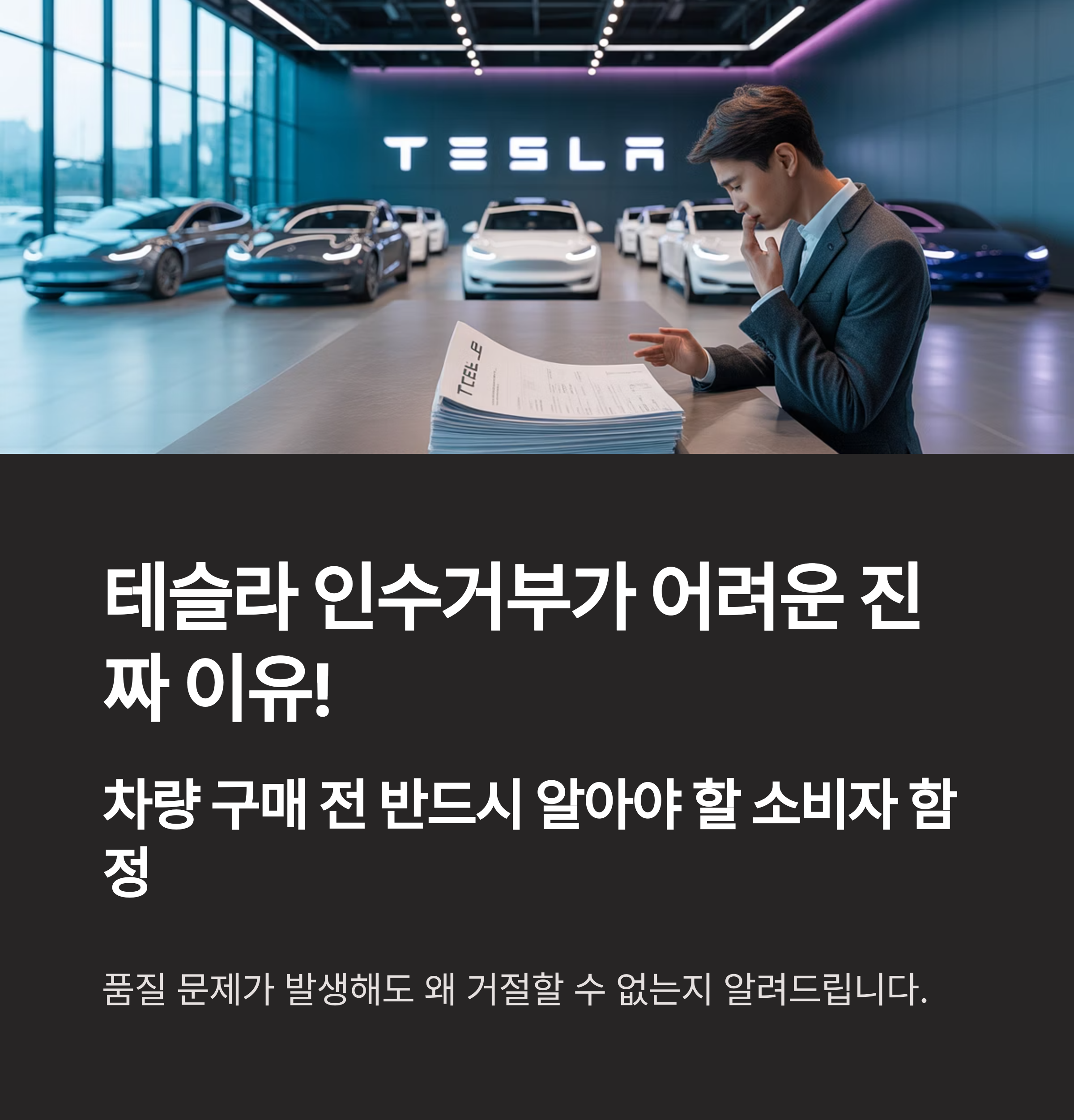 한국에서 테슬라 차량을 구매한 후 문제가 발생하더라도 인수거부가 거의 불가능한 구조라는 점, 알고 계셨나요? 많은 소비자들이 품질 문제나 결함 등을 이유로 차량 인수를 거부하려 해도, 계약 구조와 인도 시스템의 특성상 거절이 쉽지 않은 상황입니다. 이번 글에서는 그 배경과 핵심 이유들을 하나씩 짚어드립니다.