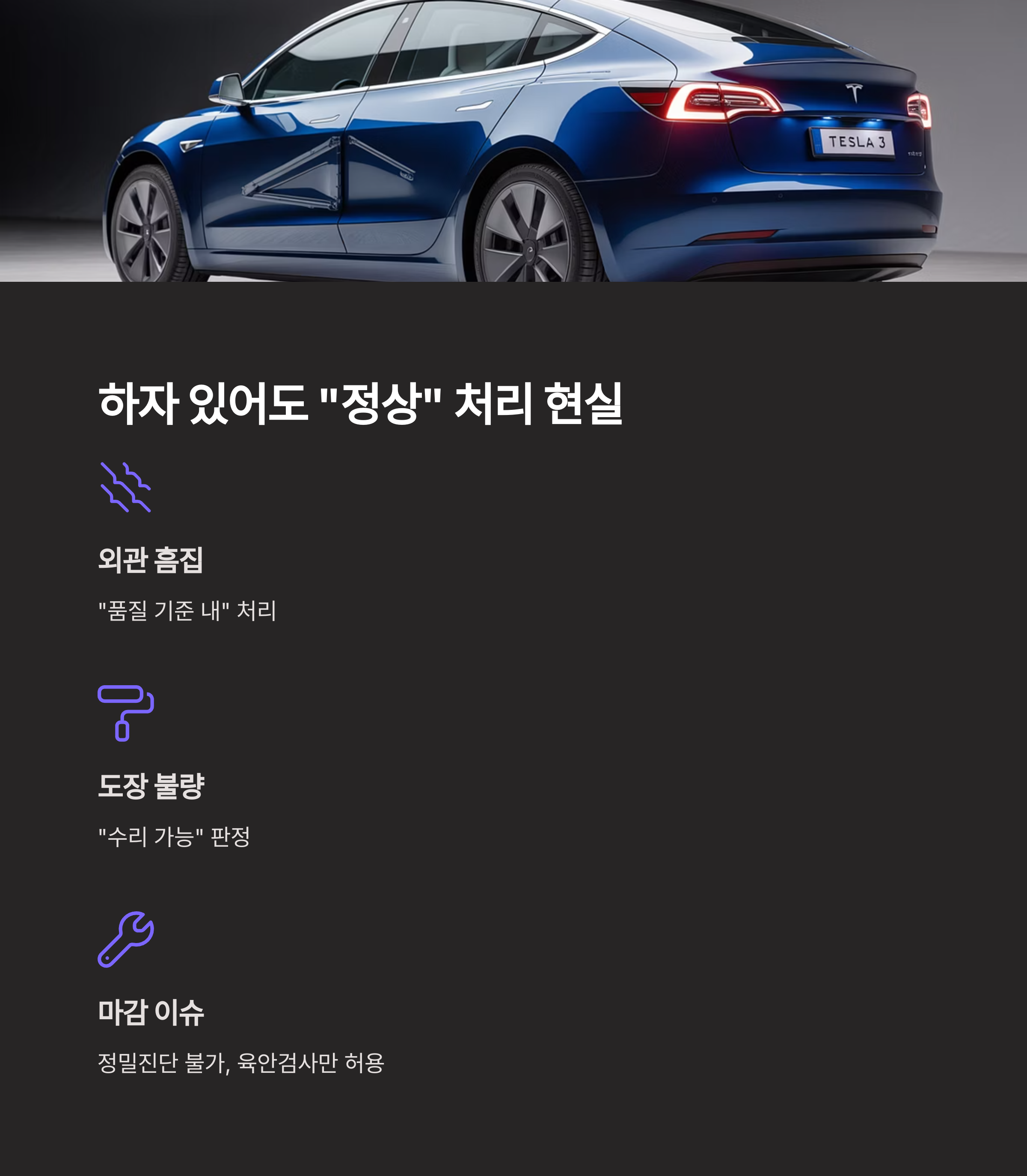 테슬라 측에서는 “품질 기준 내” 혹은 “수리 가능”으로 처리하는 경우가 많습니다.