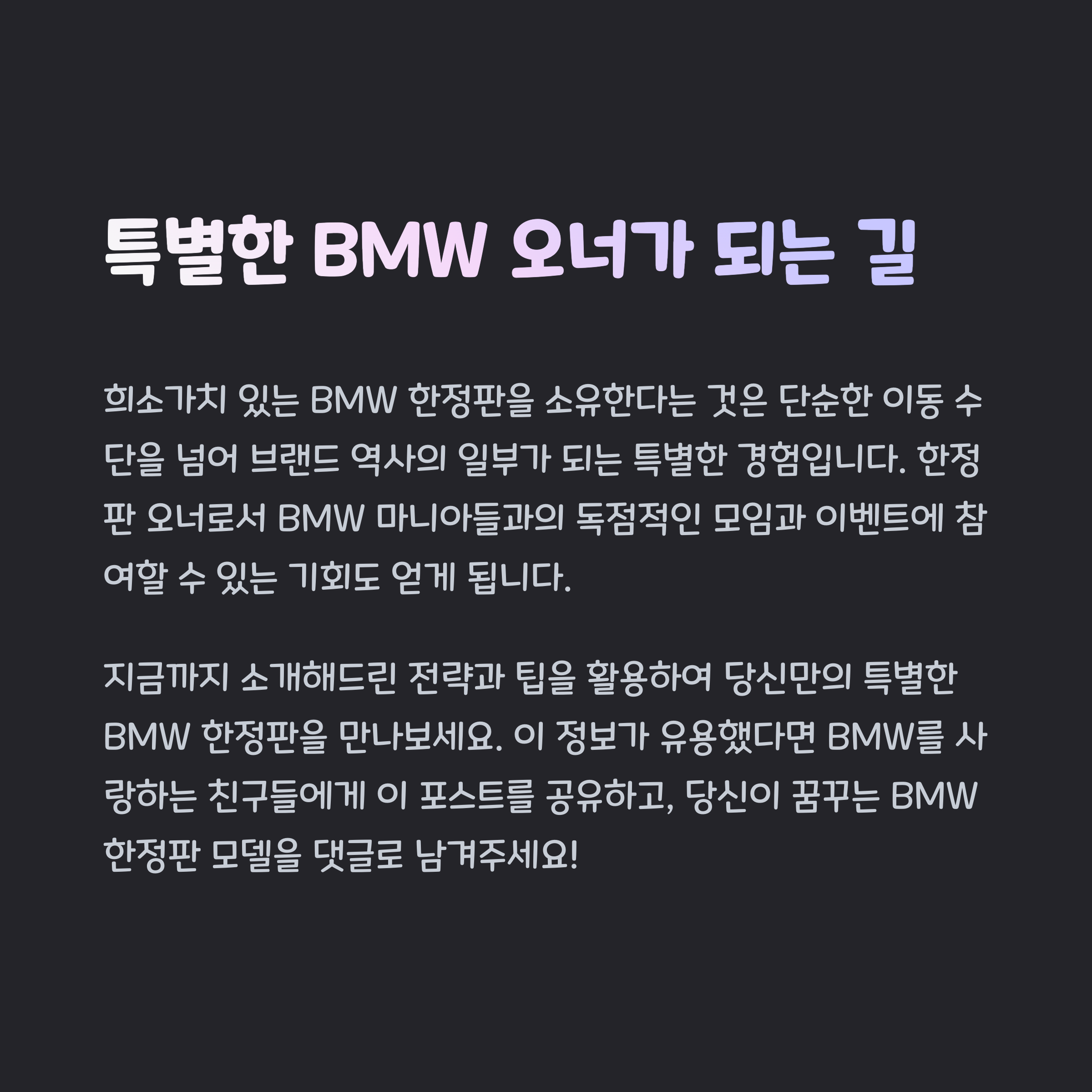 한정판 차량을 통해 자산 가치와 드라이빙 즐거움을 동시에 얻을 수 있는 방법, 그것이 바로 BMW 한정판의 매력입니다.