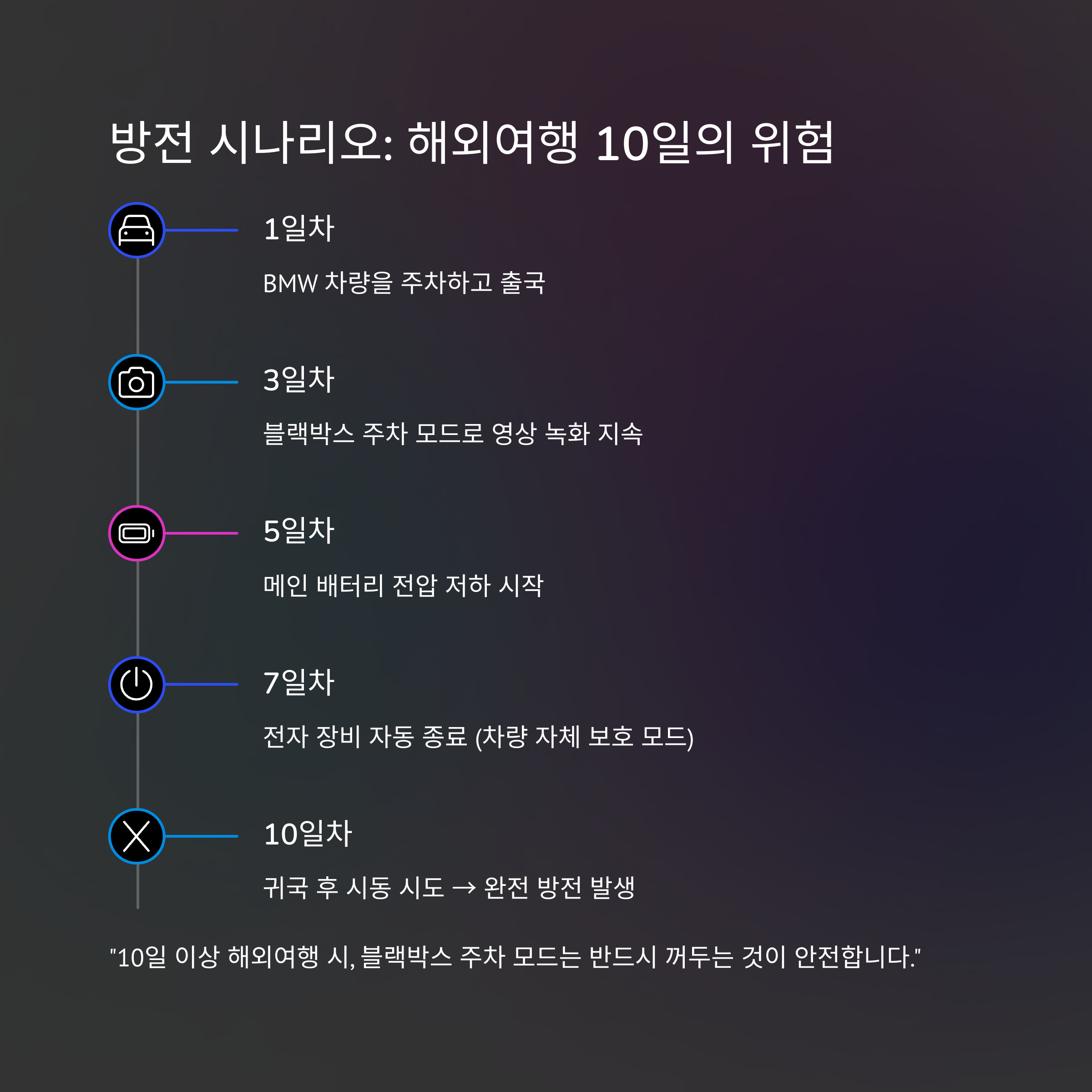 "10일 이상 해외여행 시, 블랙박스 주차 모드는 반드시 꺼두는 것이 안전합니다."
