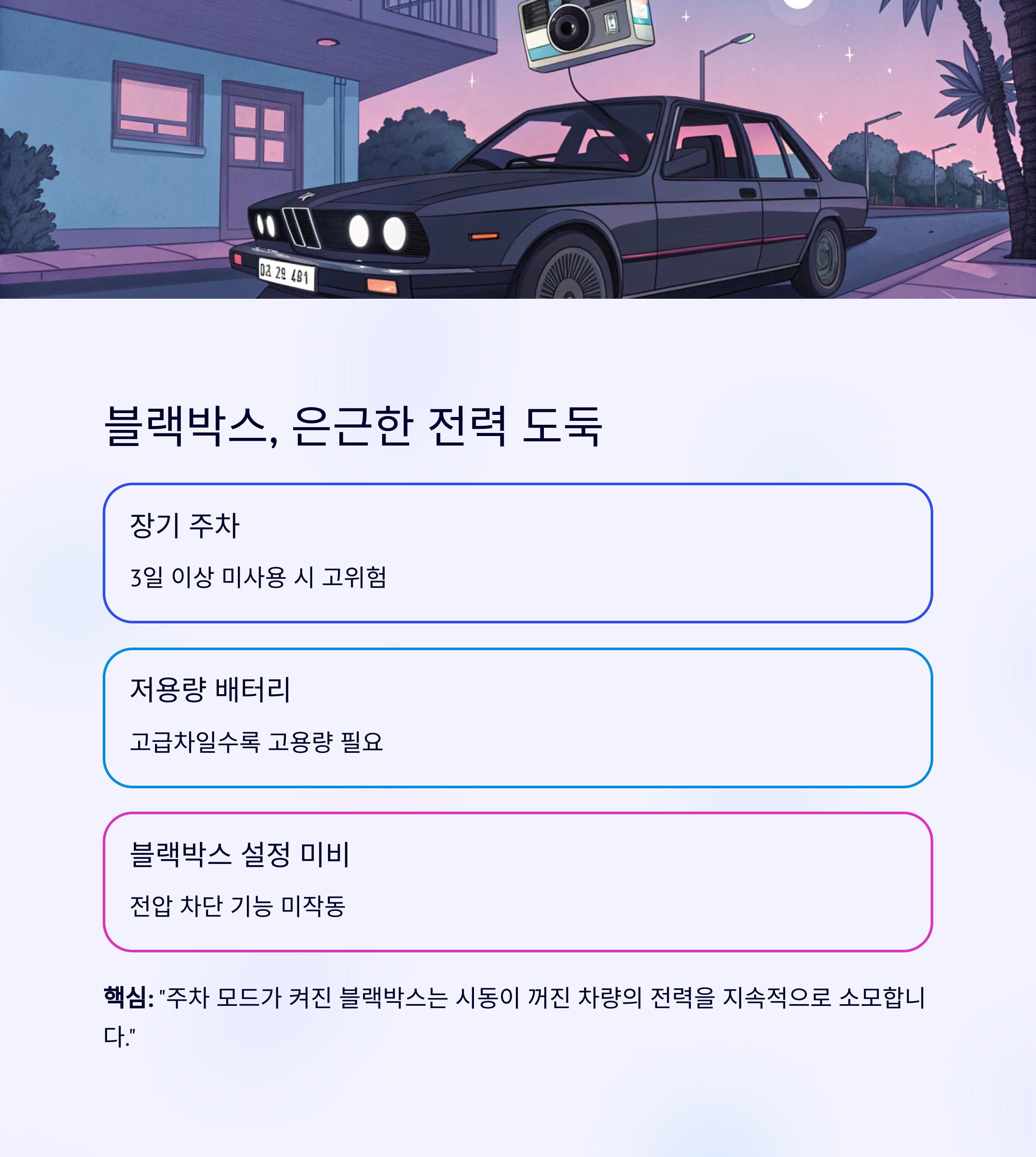 핵심: "주차 모드가 켜진 블랙박스는 시동이 꺼진 차량의 전력을 지속적으로 소모합니다."