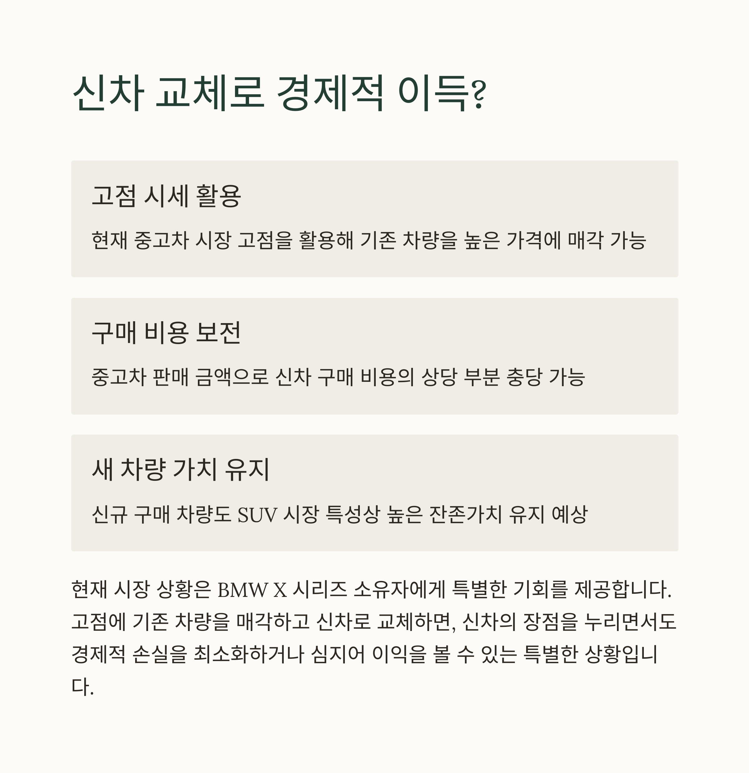 지금은 X5, X6, X7 중고차를 판매하기에 가장 적기입니다. 1~2년만 운행한 차량도 높은 가격을 받을 수 있으며, 신차 대기 없이 현금 유동성을 확보하고 새 모델로 교체하는 것이 가능합니다.