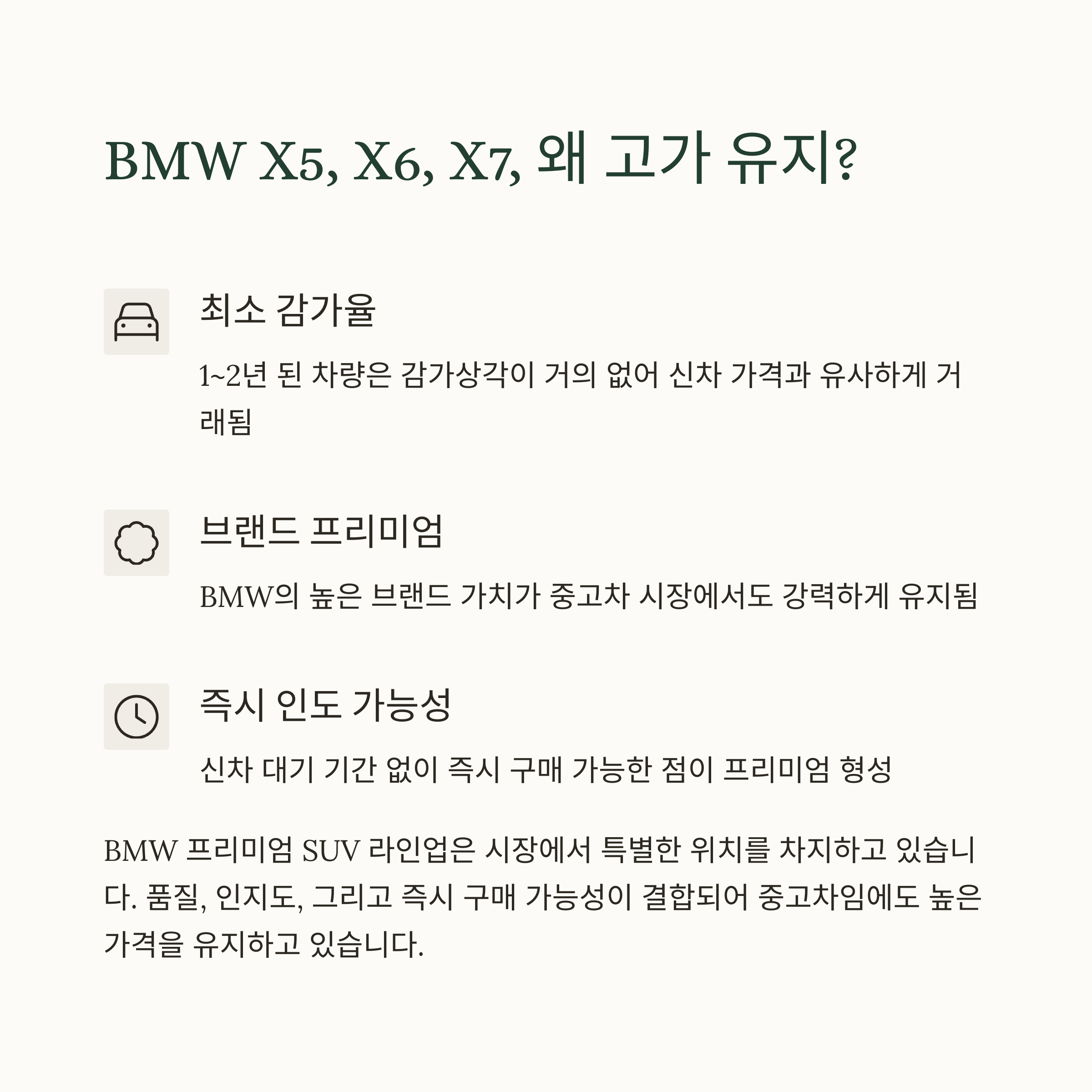 이는 차량 구입을 하나의 ‘투자’로 보는 관점에서 매우 중요한 요소입니다. 특히 X5, X6, X7은 기본 트림 자체가 고급스러워 옵션에 큰 비용을 추가하지 않아도 중고시장에서 높은 가격을 받을 수 있습니다.