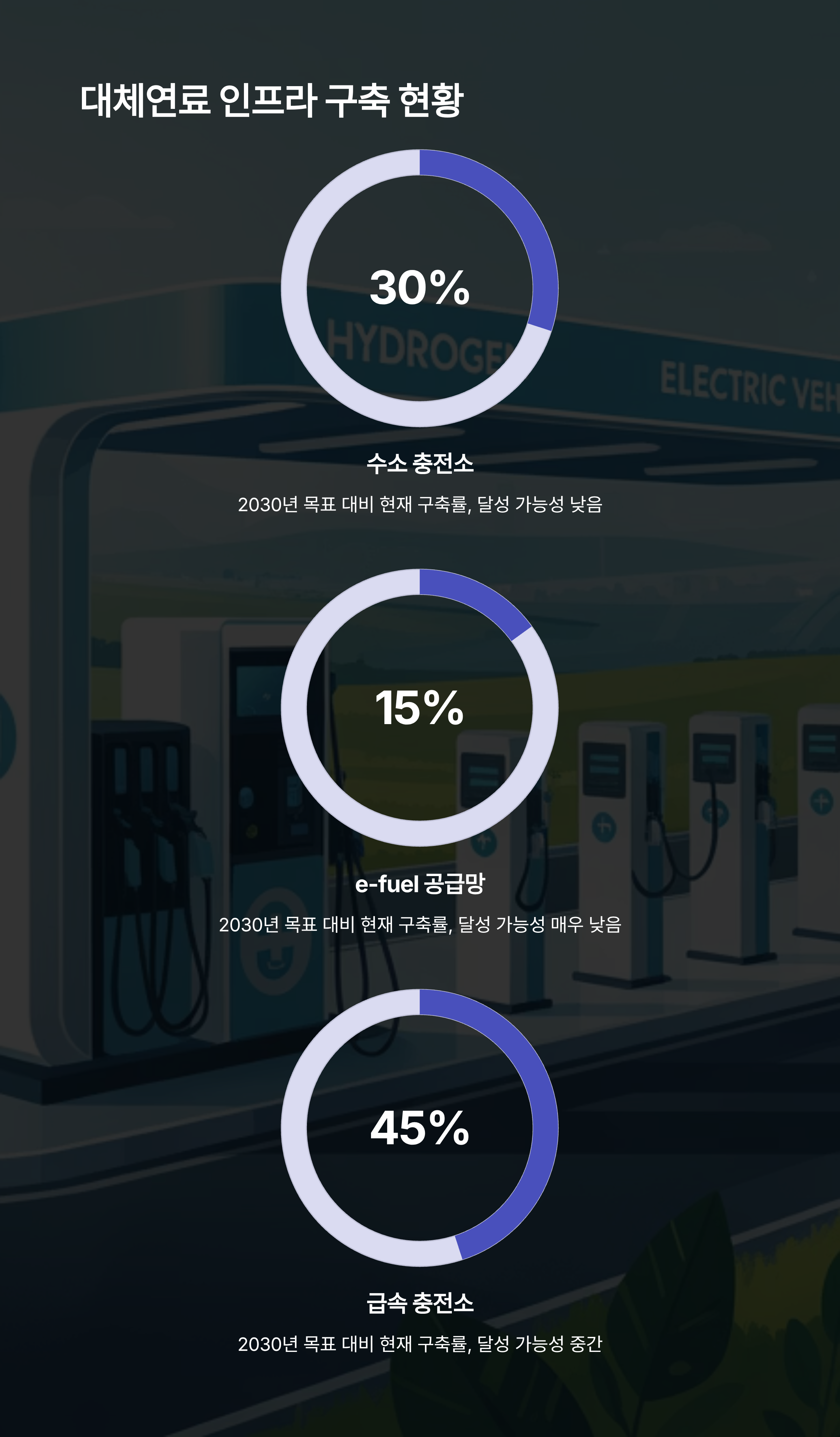 EU는 전기차 외에도 대체연료 차량(e-fuel, 수소연료 등)을 위한 인프라를 2030년까지 확보한다는 목표를 제시했지만,