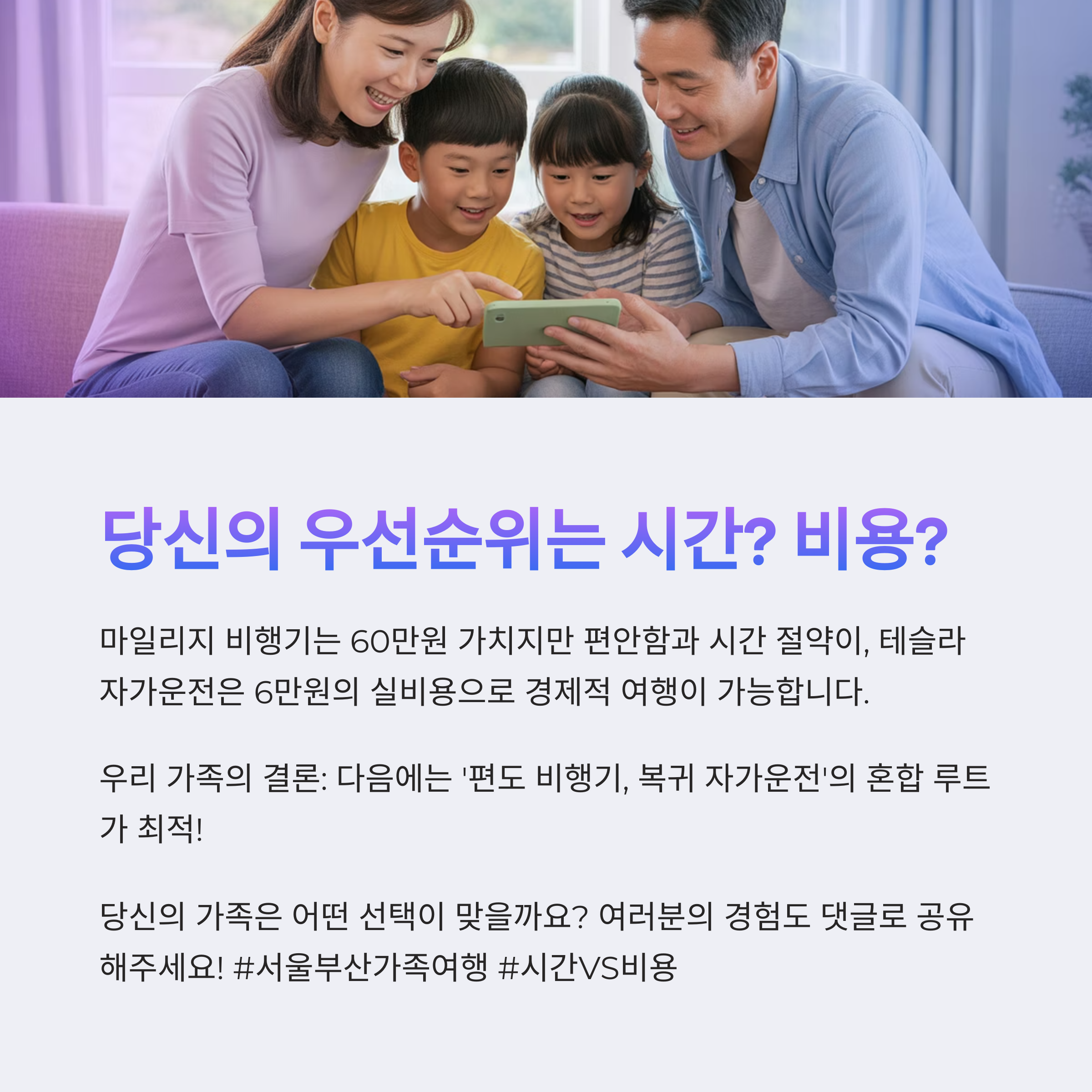 8월 여름휴가 시즌, 서울에서 부산까지 3인가족 여행을 계획하면서 비행기 마일리지 사용과 테슬라 모델Y 운전을 두고 실제 비교를 해보았습니다. 총 45,000마일을 소모한 비행기 여행과 70% 할인된 전기차 충전비를 바탕으로 한 자가운전의 차이점, 장단점, 체감 효율성까지 모두 경험 기반으로 전해드립니다.