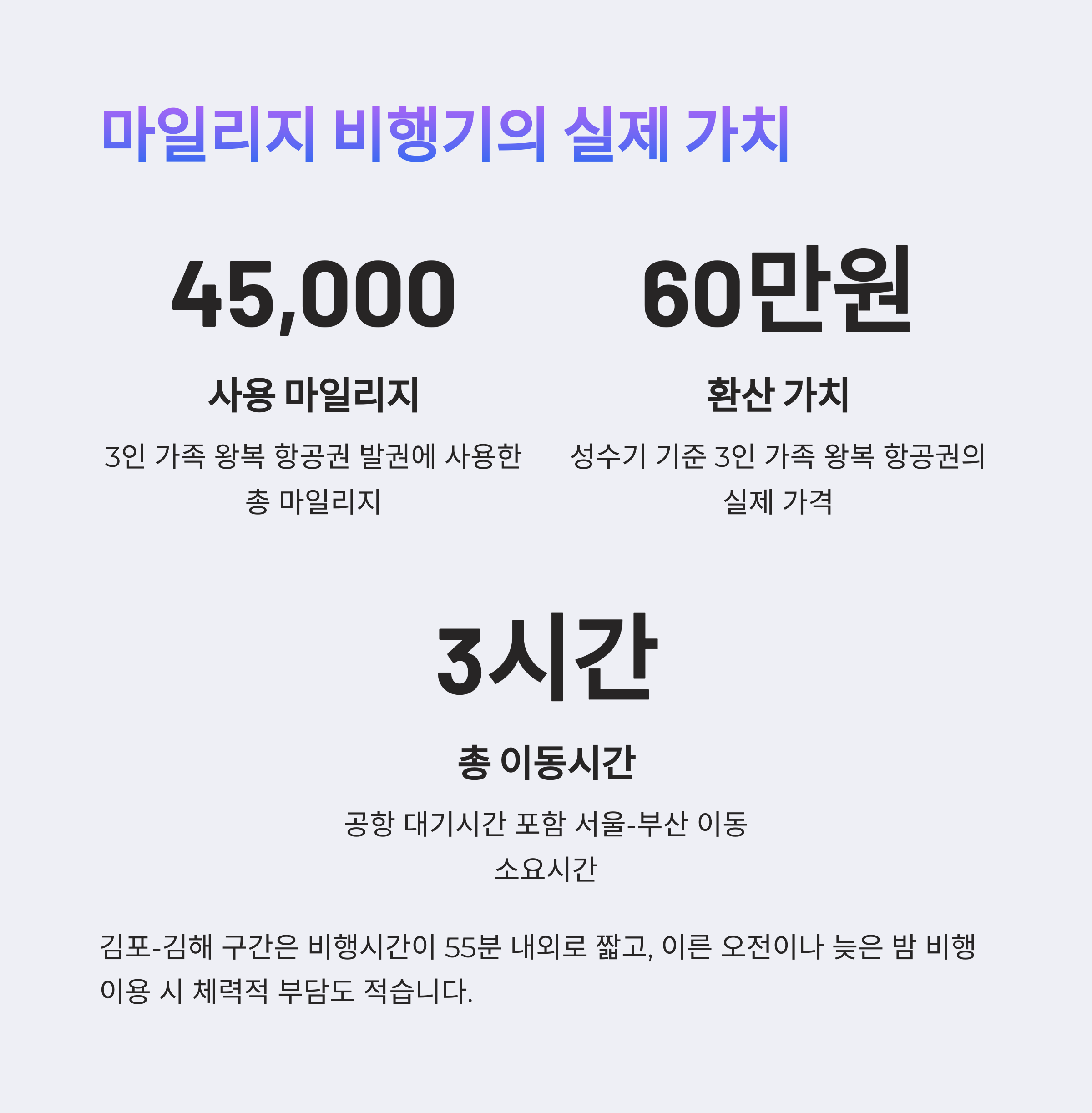 마일리지 45,000점으로 왕복 발권했다면 약 60만 원 이상의 혜택을 받은 셈이죠.