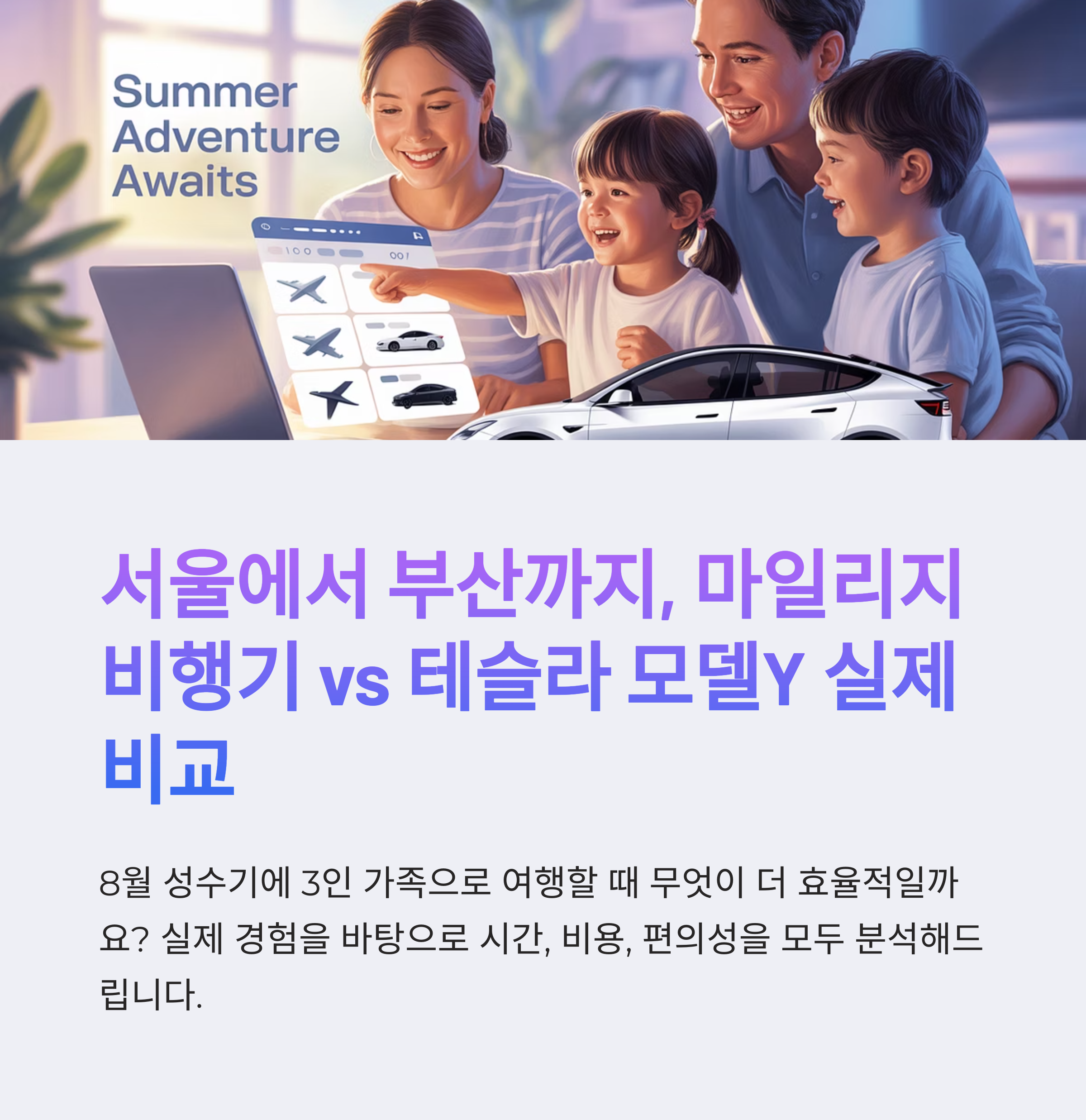8월 여름휴가 시즌, 서울에서 부산까지 3인가족 여행을 계획하면서 비행기 마일리지 사용과 테슬라 모델Y 운전을 두고 실제 비교를 해보았습니다. 총 45,000마일을 소모한 비행기 여행과 70% 할인된 전기차 충전비를 바탕으로 한 자가운전의 차이점, 장단점, 체감 효율성까지 모두 경험 기반으로 전해드립니다.