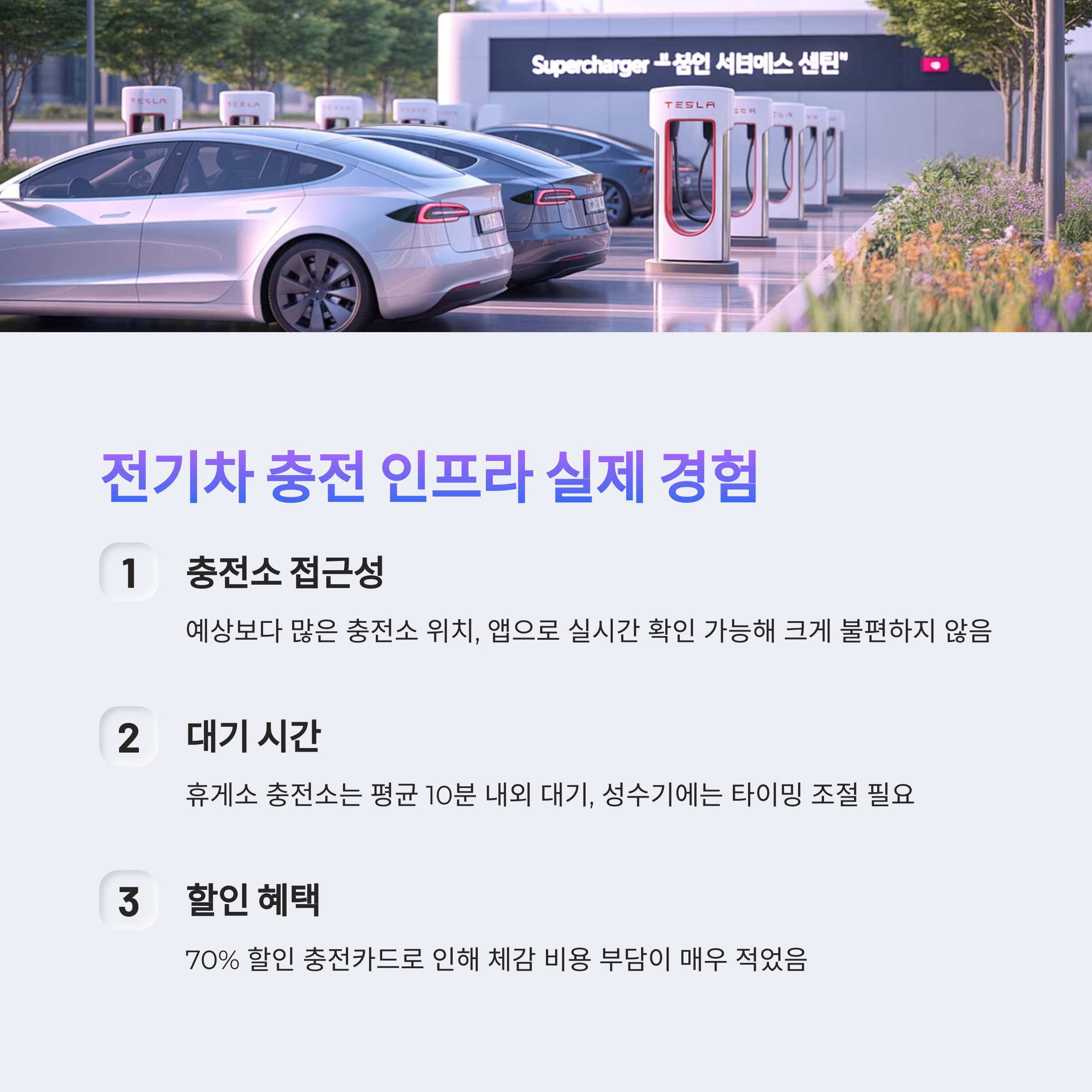 충전 횟수는 3~4회, 슈퍼차저 외 민간 충전소도 함께 사용했습니다.
