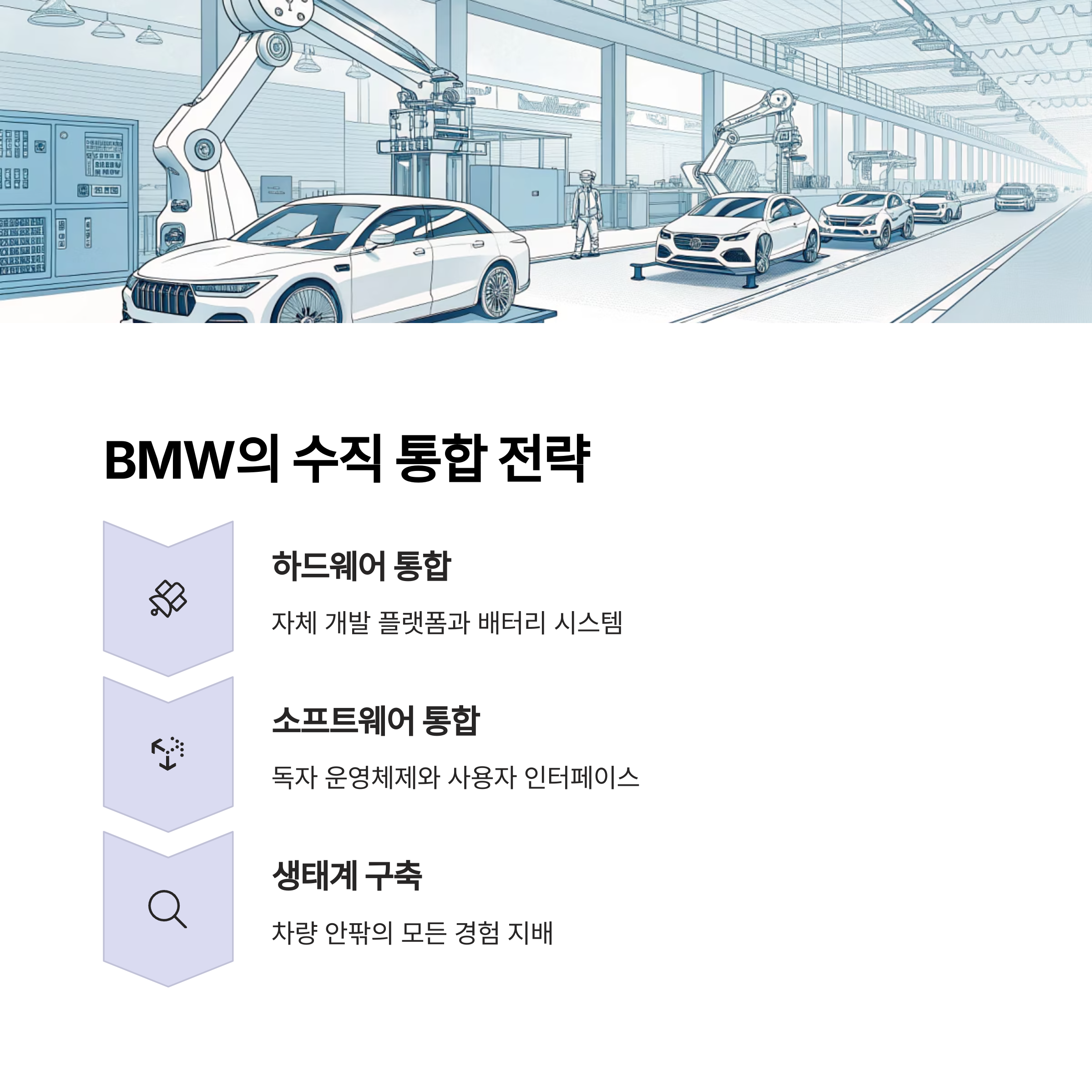 BMW는 노이어 클라쎄를 통해 하드웨어와 소프트웨어의 수직 통합 모델을 완성하겠다는 포부를 가지고 있습니다.
