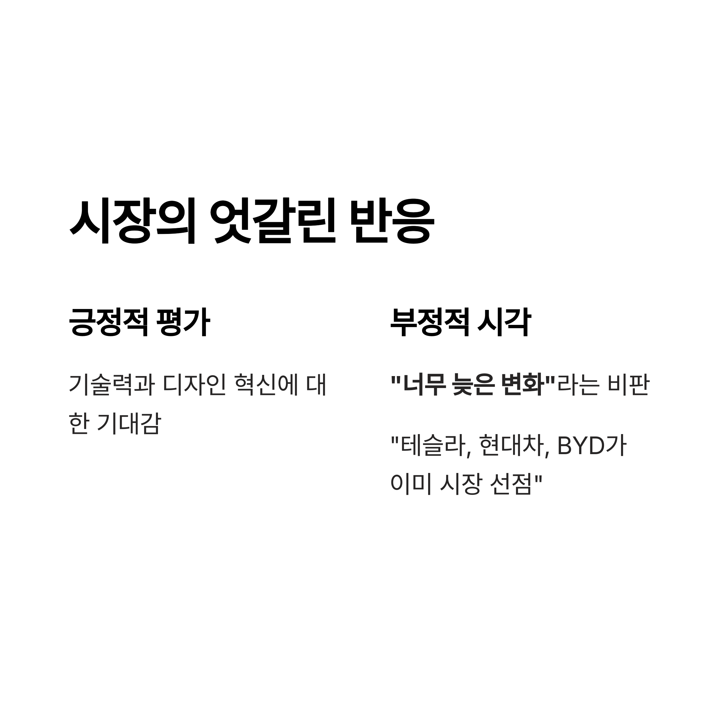 "이미 테슬라와 현대차, BYD가 시장을 선점한 상황"이라고 분석합니다.