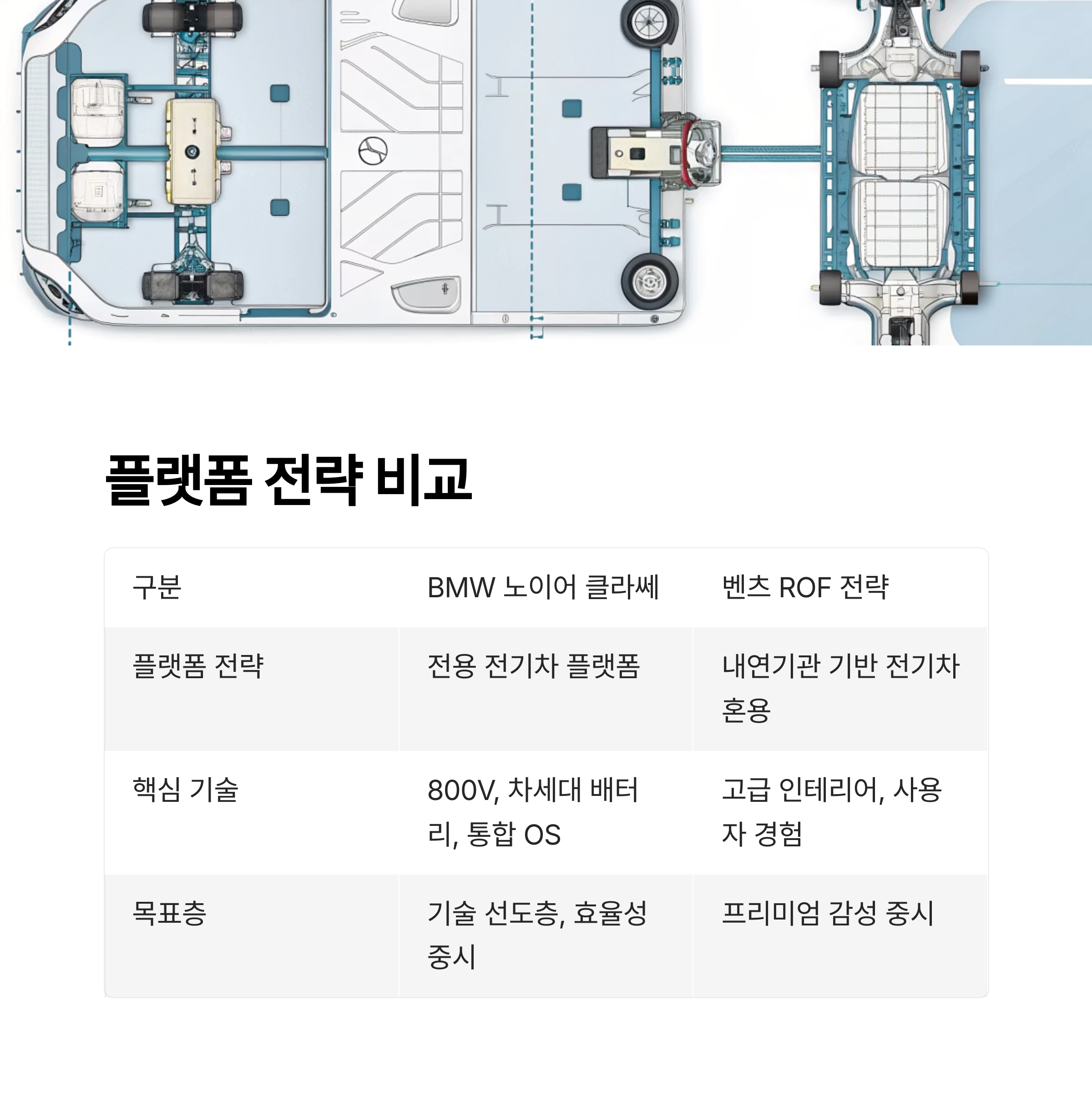 | 플랫폼 전략 | 전용 전기차 플랫폼 | 내연기관 기반 전기차 혼용 |