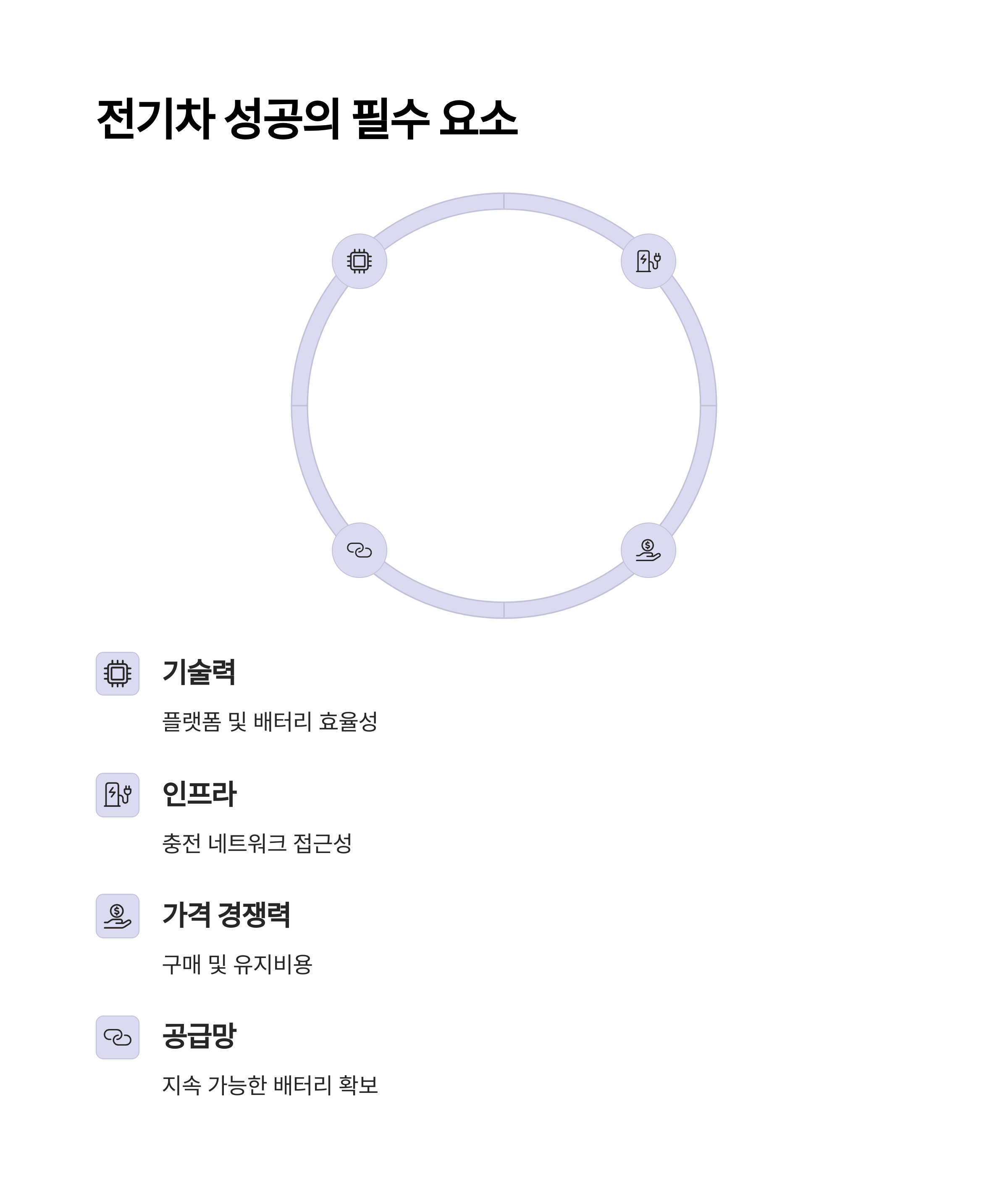 실질적인 고객 경험과 유지비용, 충전 인프라에서의 실질 경쟁력 확보가 필수입니다.