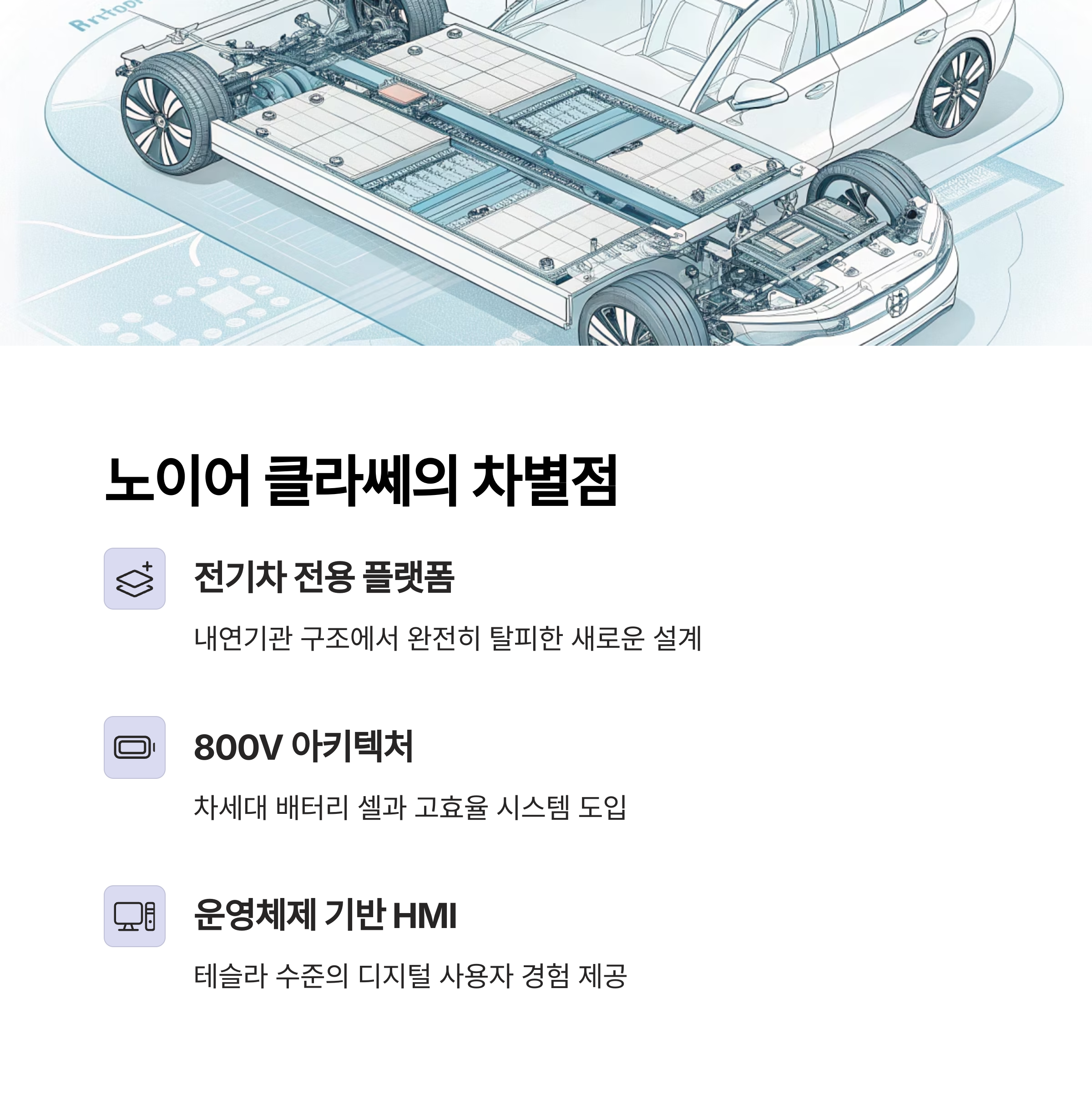 | 핵심 기술 | 800V, 차세대 배터리, 통합 OS | 고급 인테리어, 사용자 경험 |