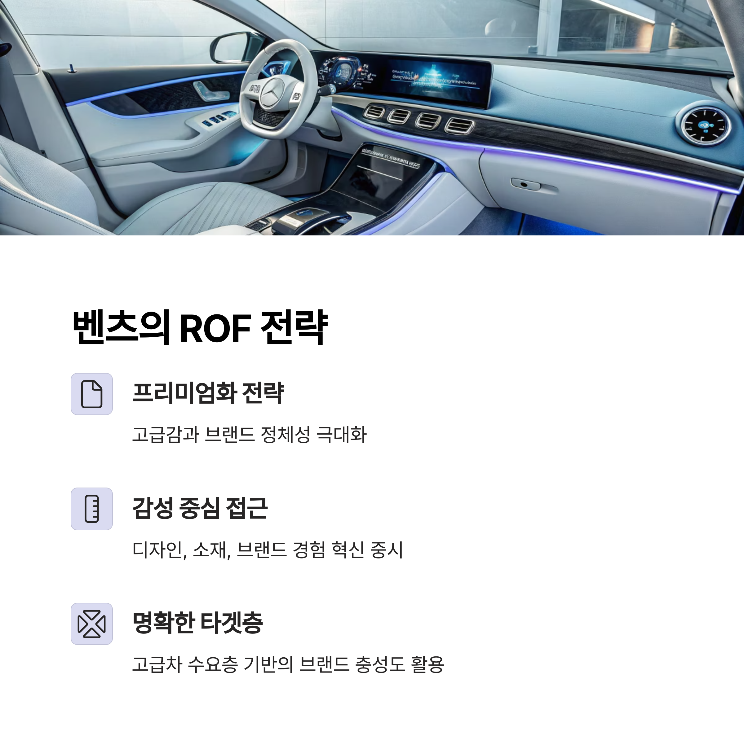 반면, 벤츠는 감성과 전통에 기대어 브랜드 중심의 고급화 전략을 전개하고 있습니다.