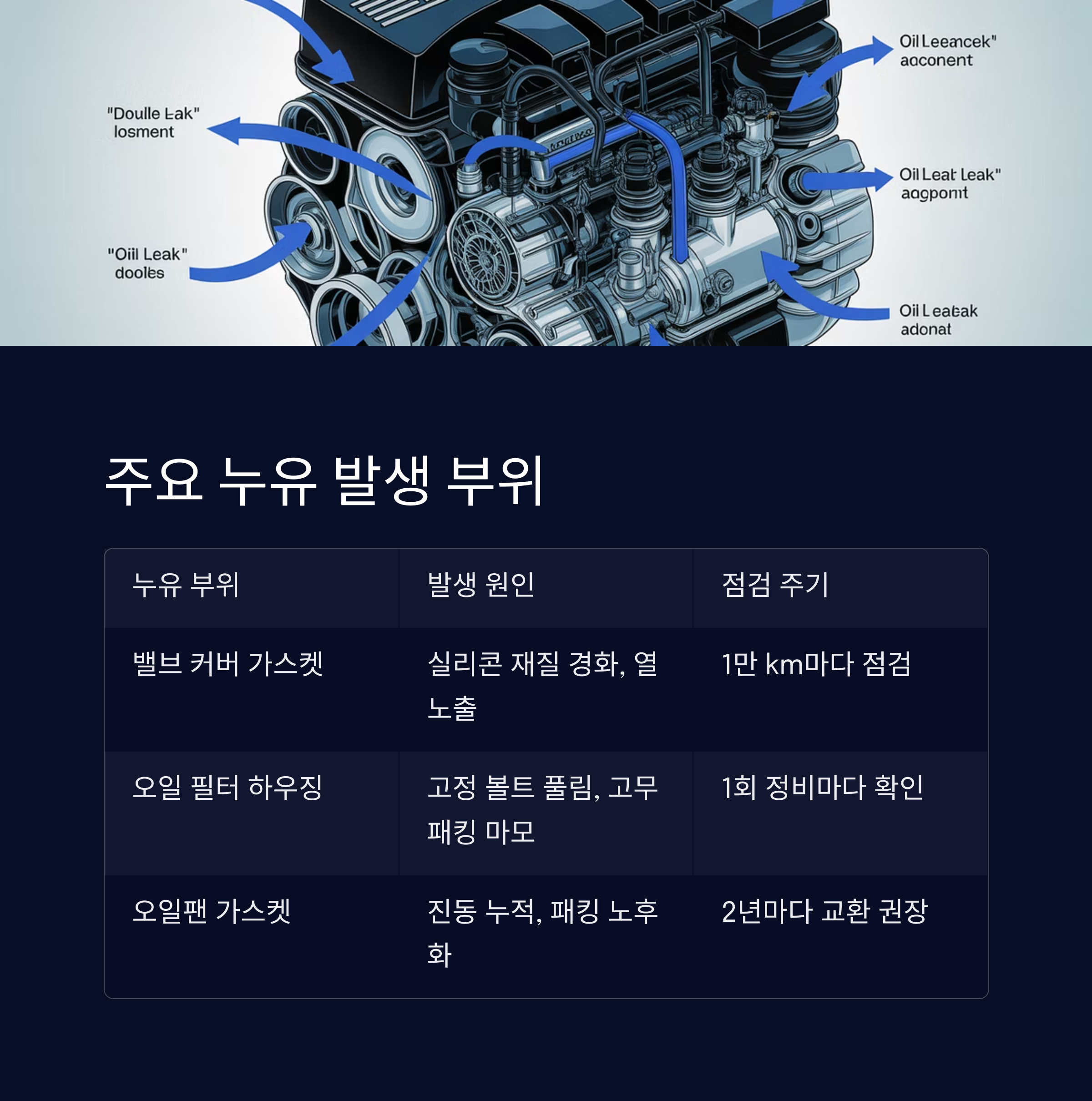 "오일 필터 하우징과 밸브 커버 가스켓도 확인해주세요" 라고 구체적으로 요청하세요.