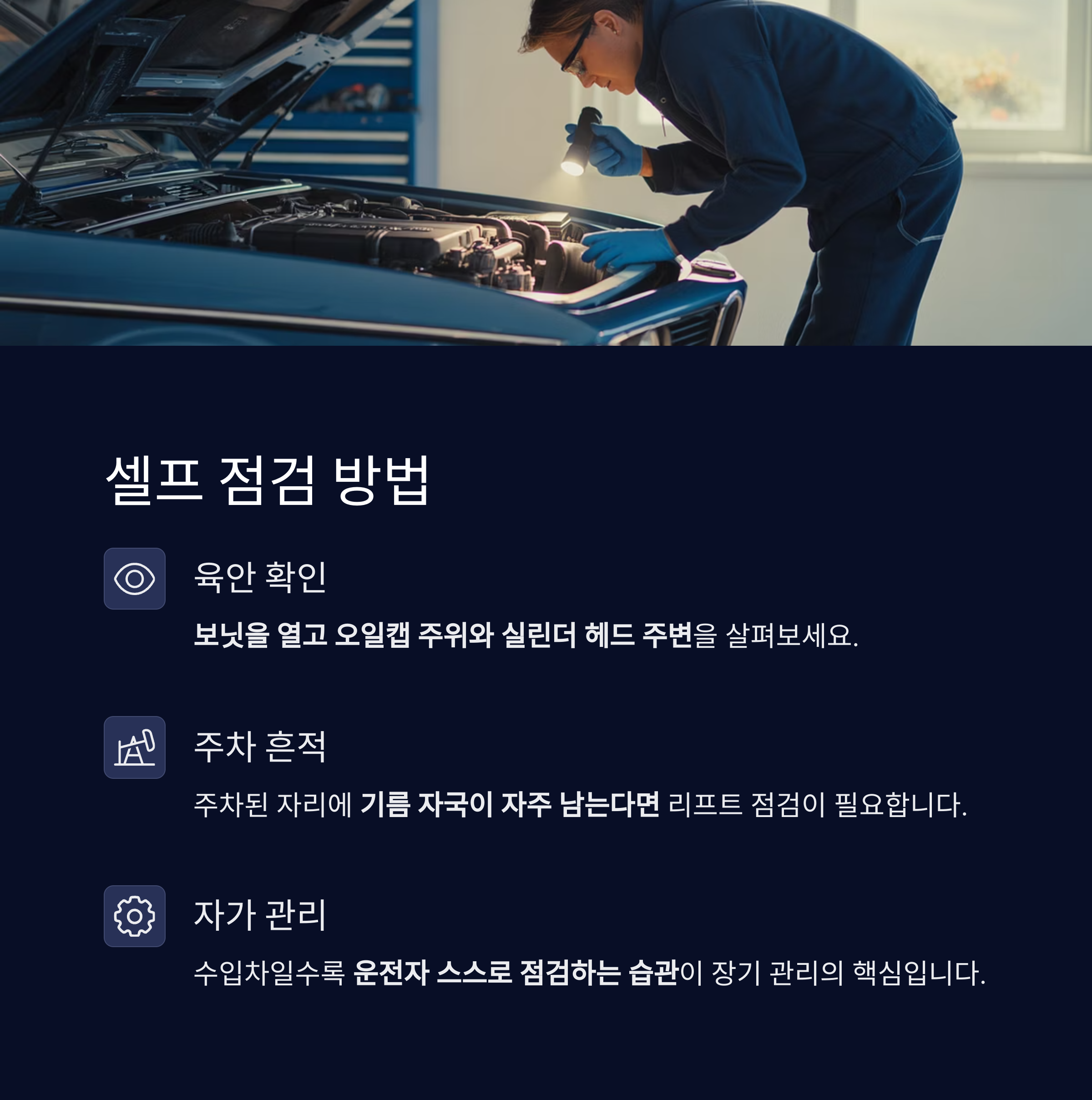 운전자 스스로가 점검하는 습관을 들이는 것이 장기 관리의 핵심입니다.