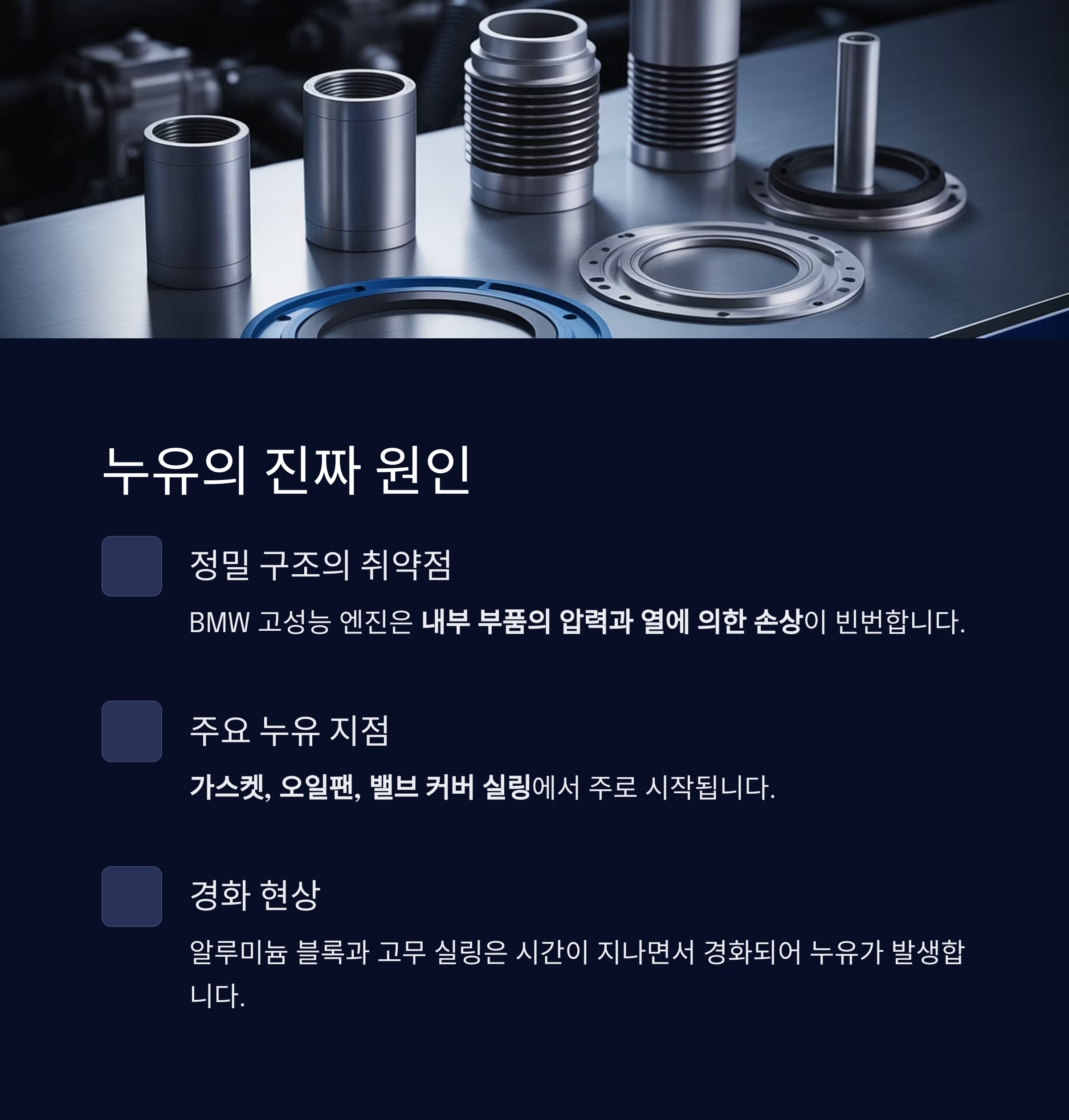 BMW 특유의 알루미늄 블록과 고무 실링 구조는 시간이 지나면서 경화되기 쉬워