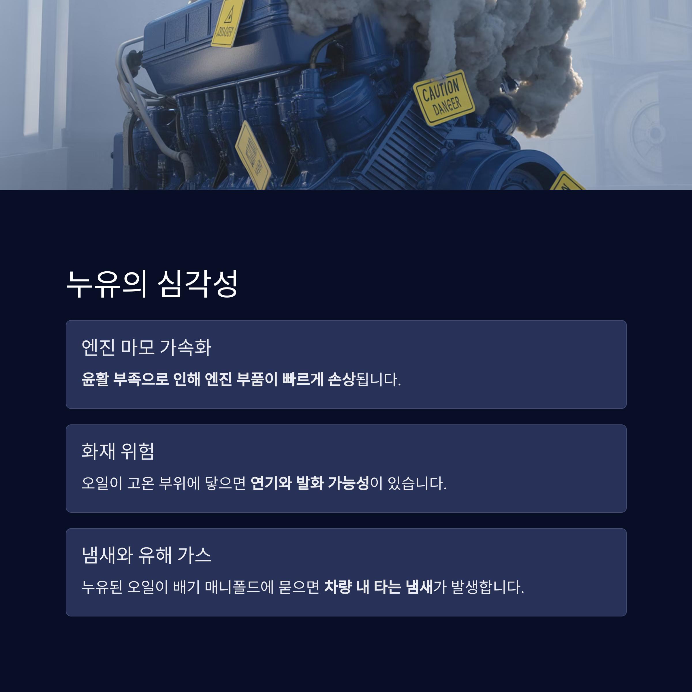 하지만 정밀한 엔진 구조일수록 누유에 취약하다는 점을 간과해선 안 됩니다.