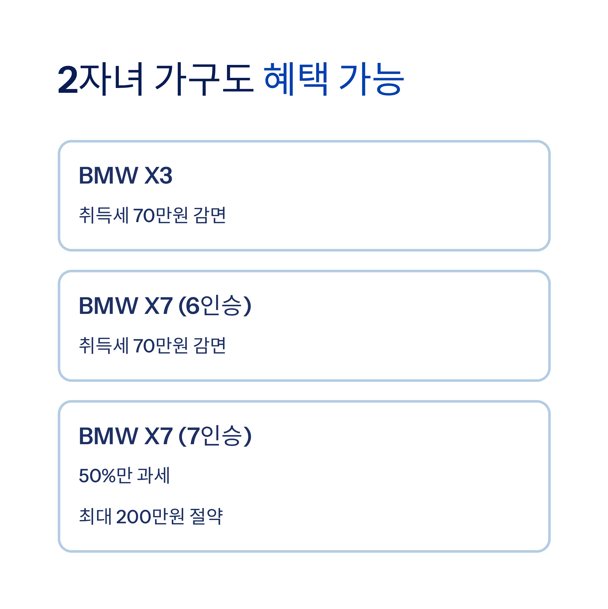 | BMW X7 (7인승) | 50%만 과세 | ❌ 미적용 | 최대 200만원 |