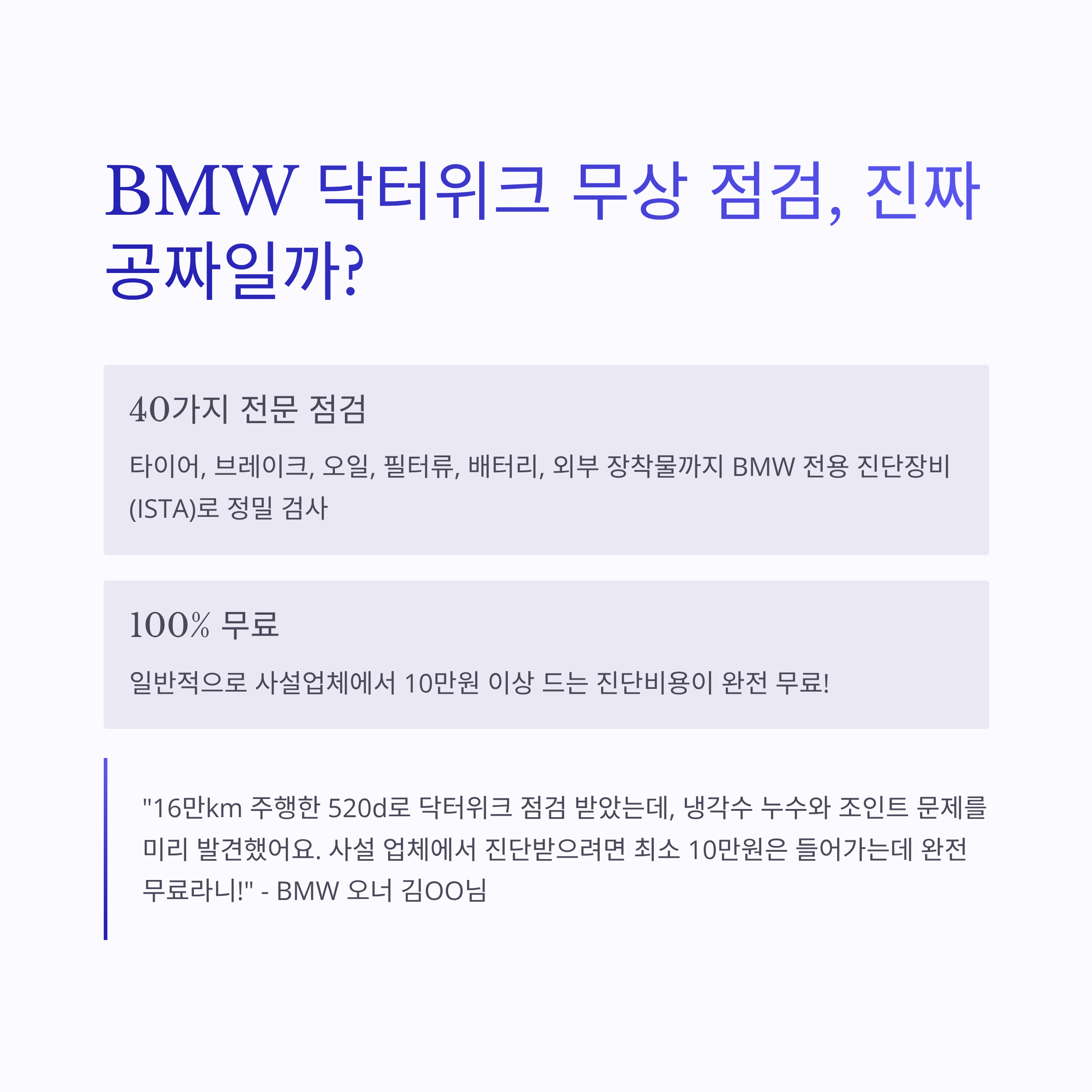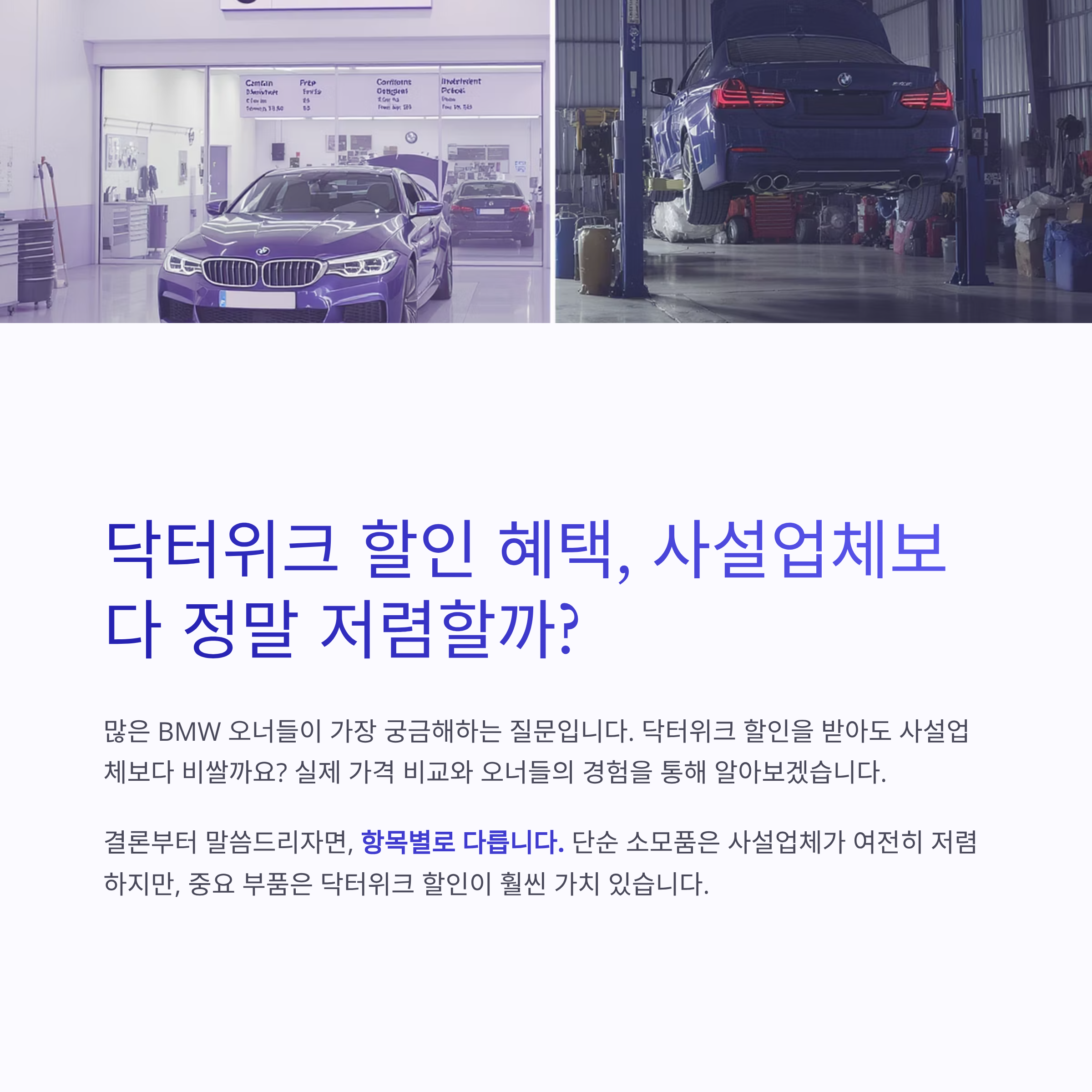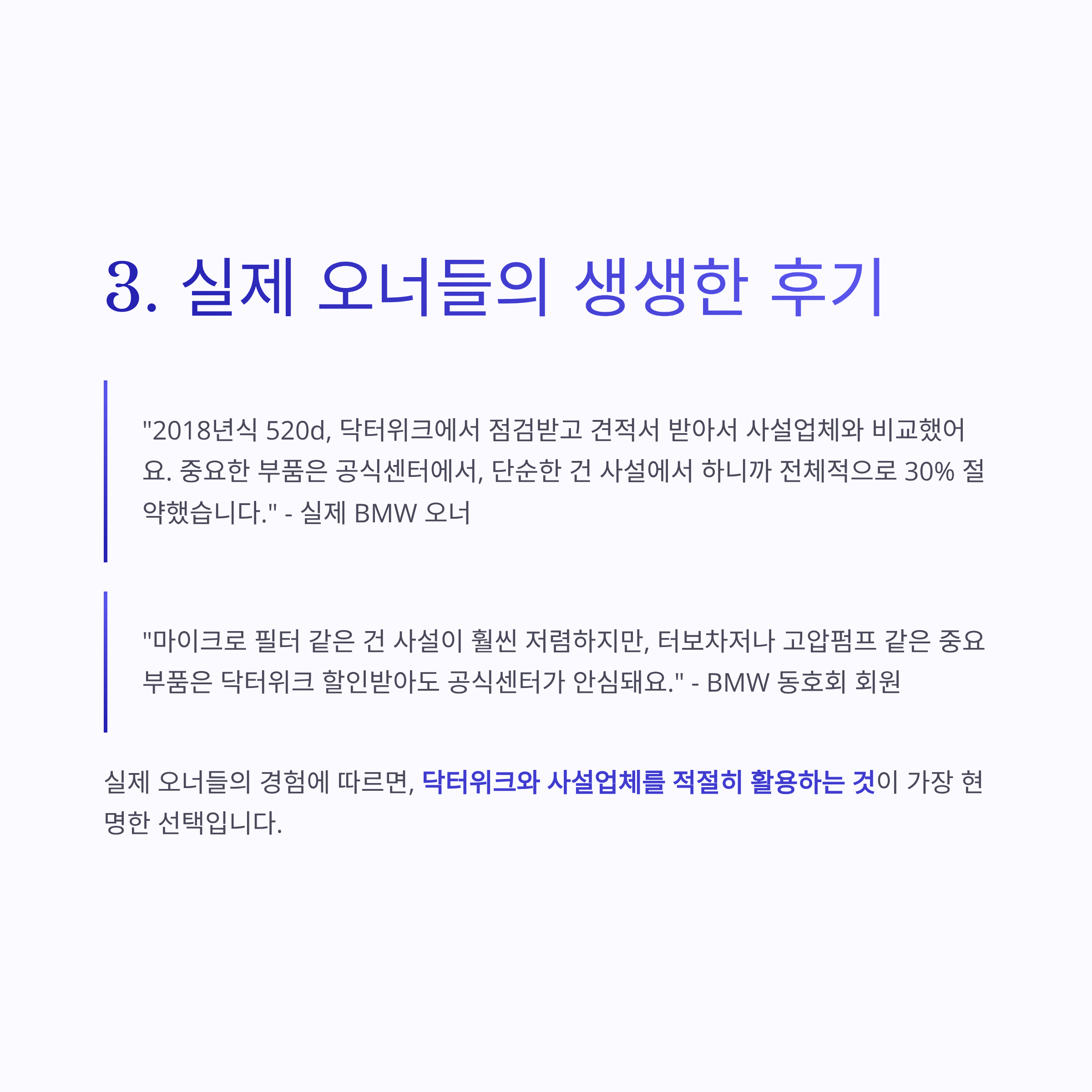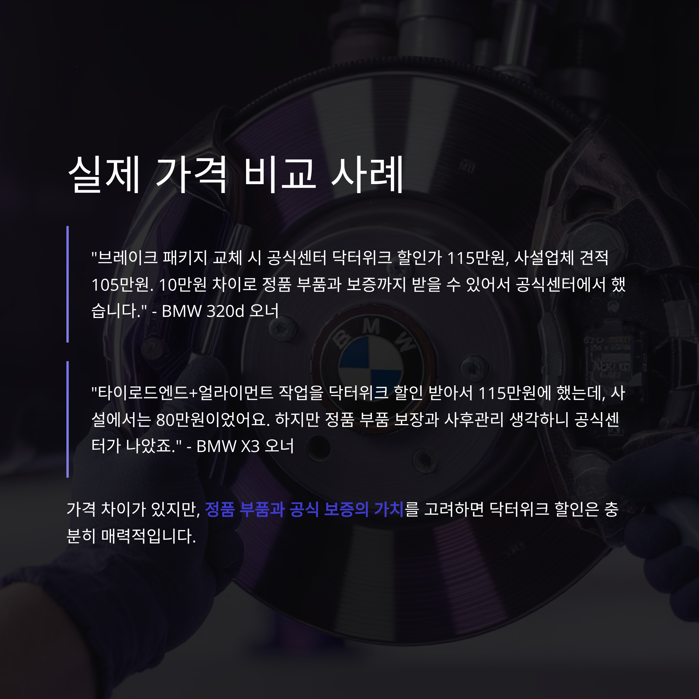 "마이크로 필터 같은 건 사설이 훨씬 저렴하지만, 터보차저나 고압펌프 같은 중요 부품은 닥터위크 할인받아도 공식센터가 안심돼요." - BMW 동호회 회원