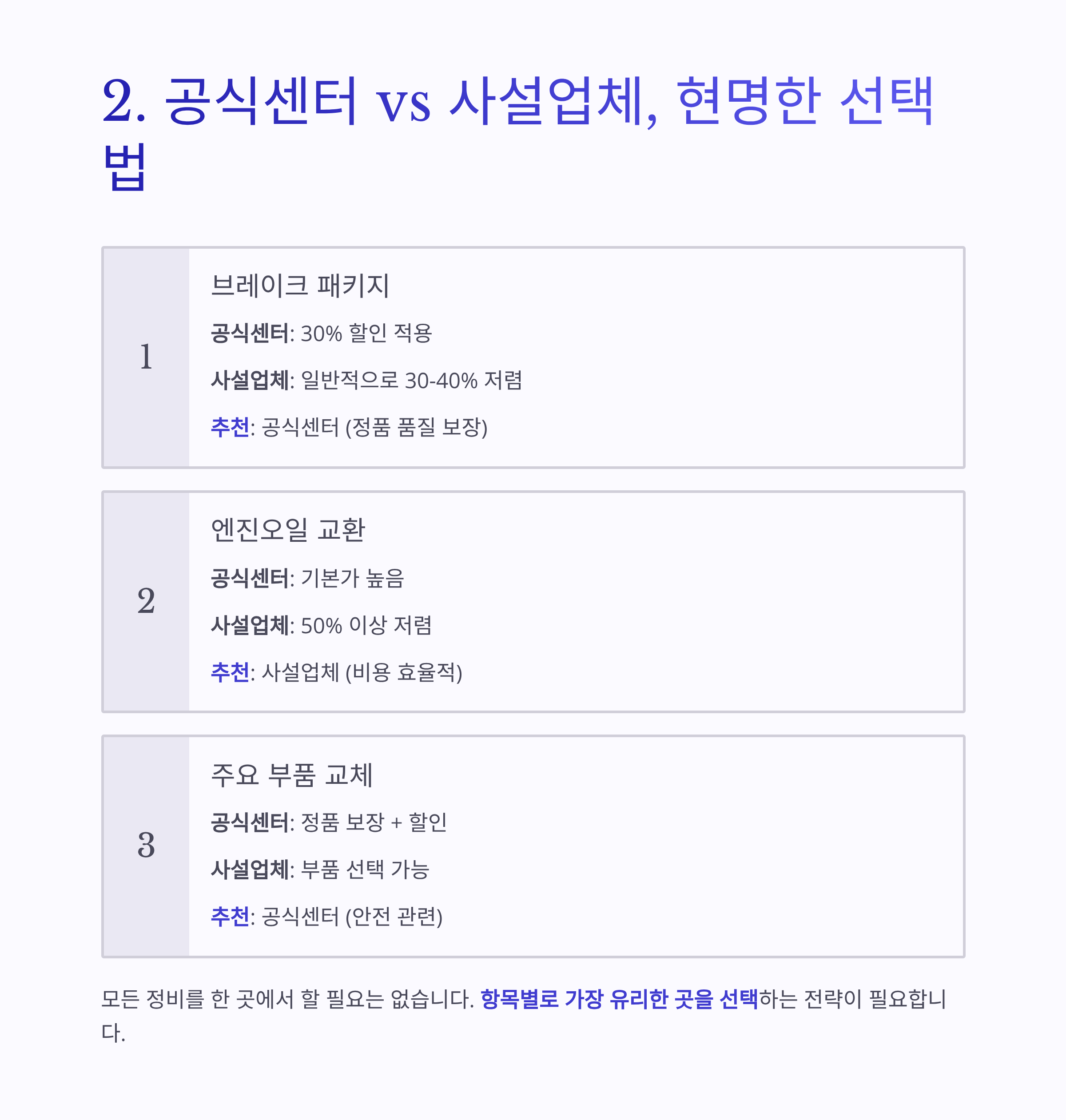 | 엔진오일 교환 | 기본가 높음 | 50% 저렴 | 사설업체 |