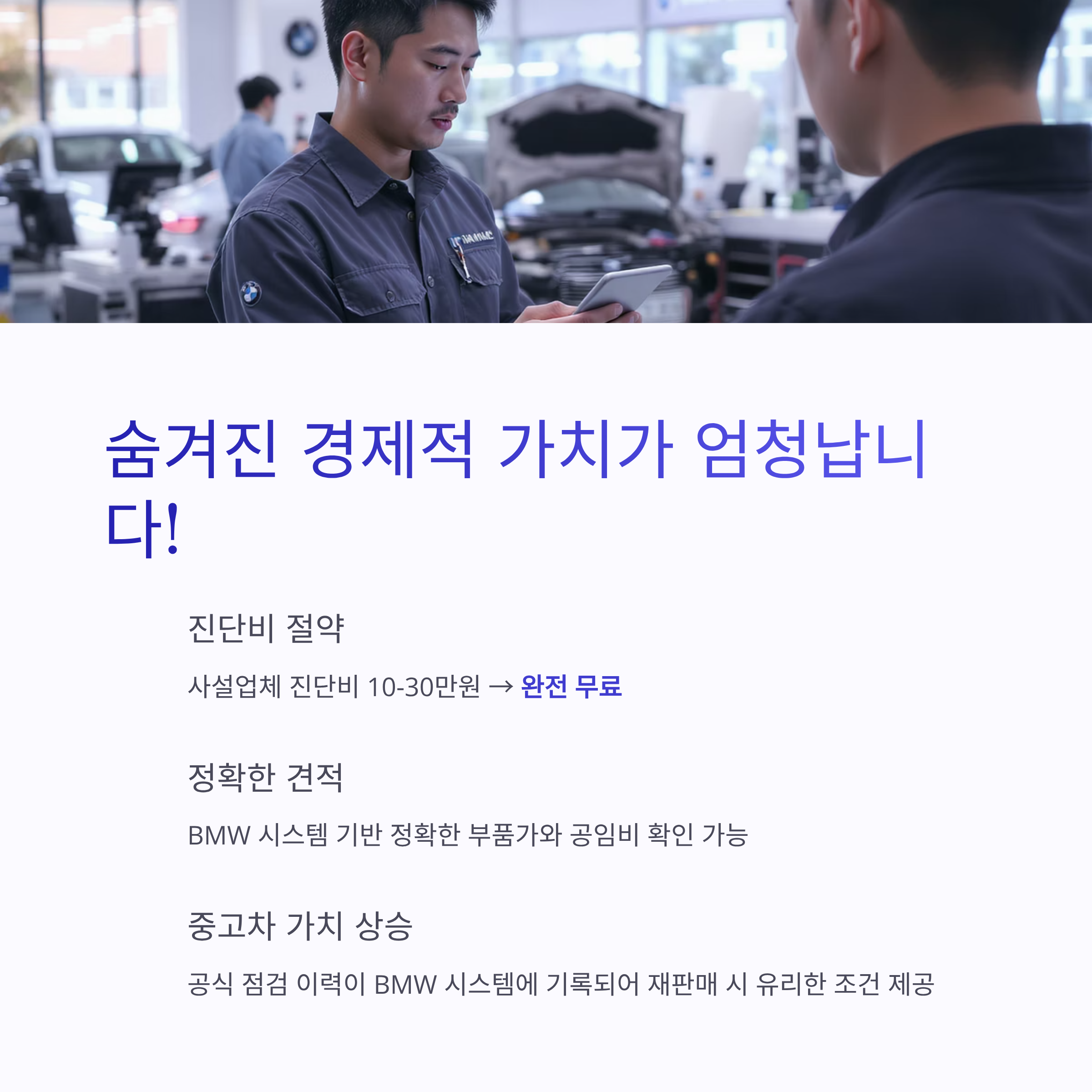 - 정확한 견적: BMW 시스템 기반 정확한 부품가와 공임비 확인