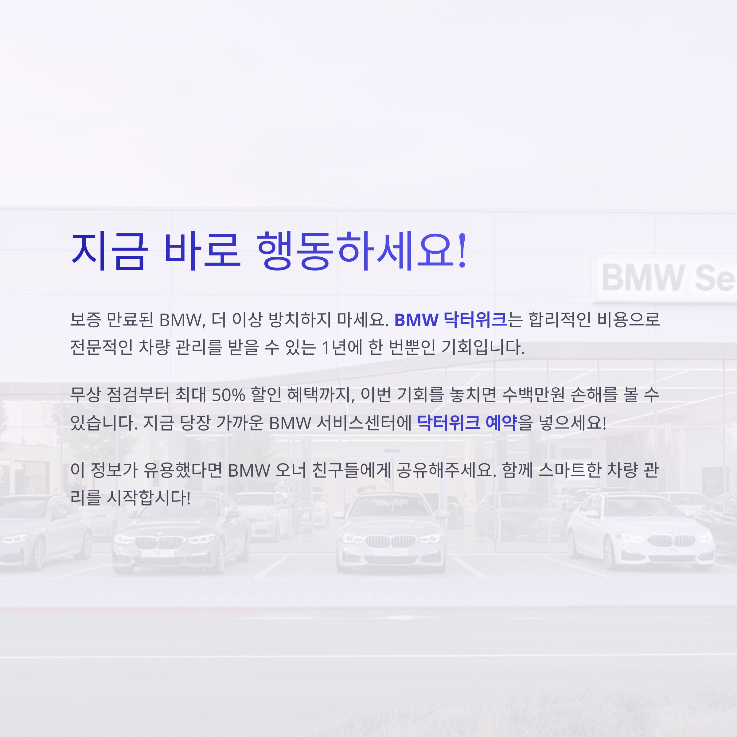 무상 점검부터 최대 50% 할인 혜택까지, 이번 기회를 놓치면 수백만원 손해를 볼 수 있습니다. 지금 당장 가까운 BMW 서비스센터에 닥터위크 예약을 넣으세요!