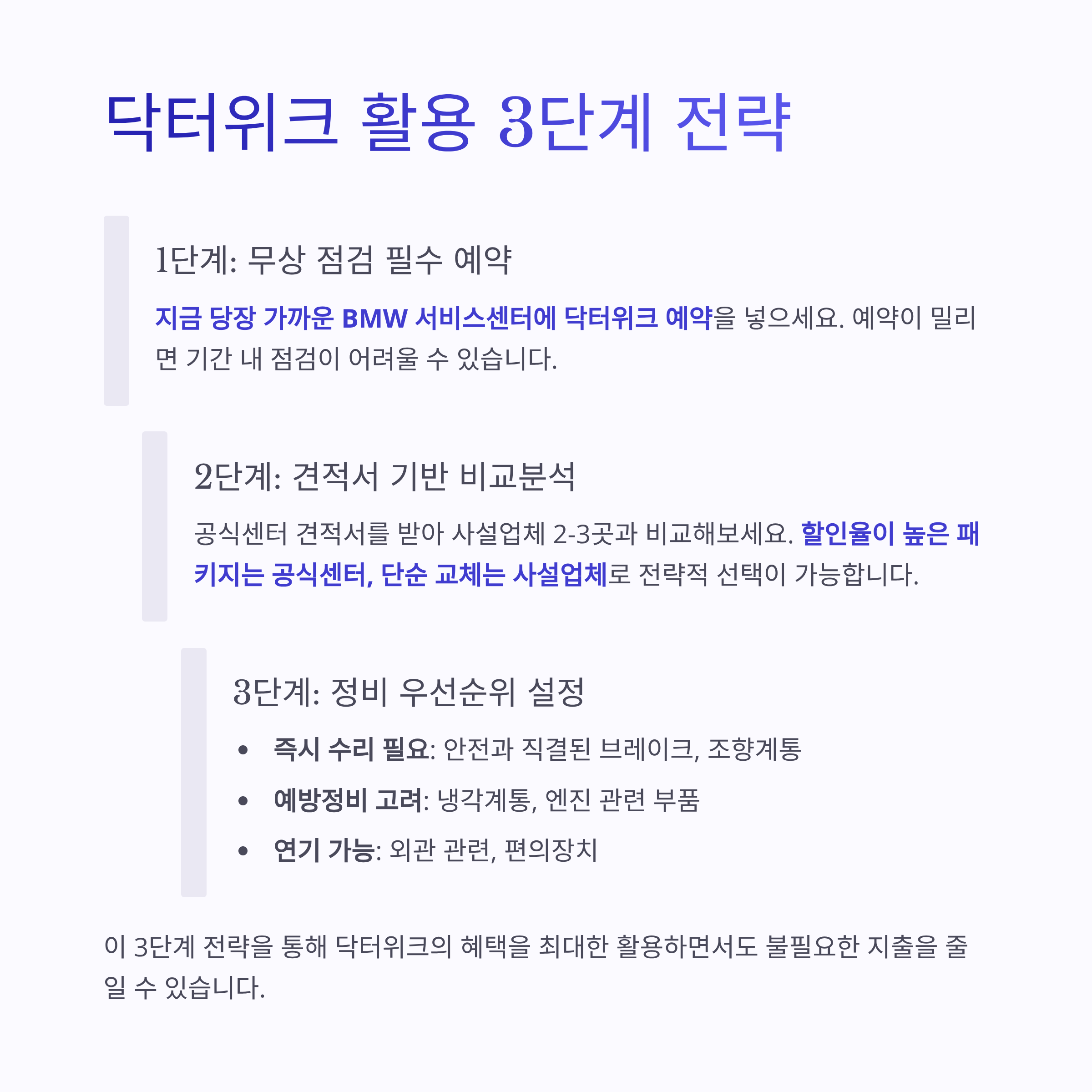 지금 당장 가까운 BMW 서비스센터에 닥터위크 예약을 넣으세요. 예약이 밀리면 기간 내 점검이 어려울 수 있습니다.