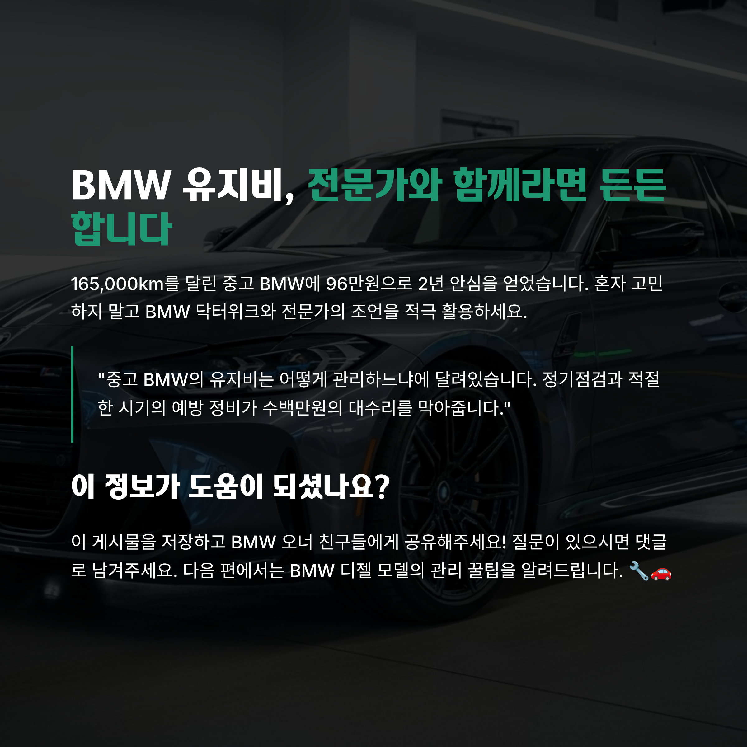 결과적으로는 96만원 투자로 2년 보증까지 받는 대박 딜을 성사시켰습니다. 어떻게 이런 결과가 나왔는지, BMW 유지관리의 모든 것을 공유해드리겠습니다.