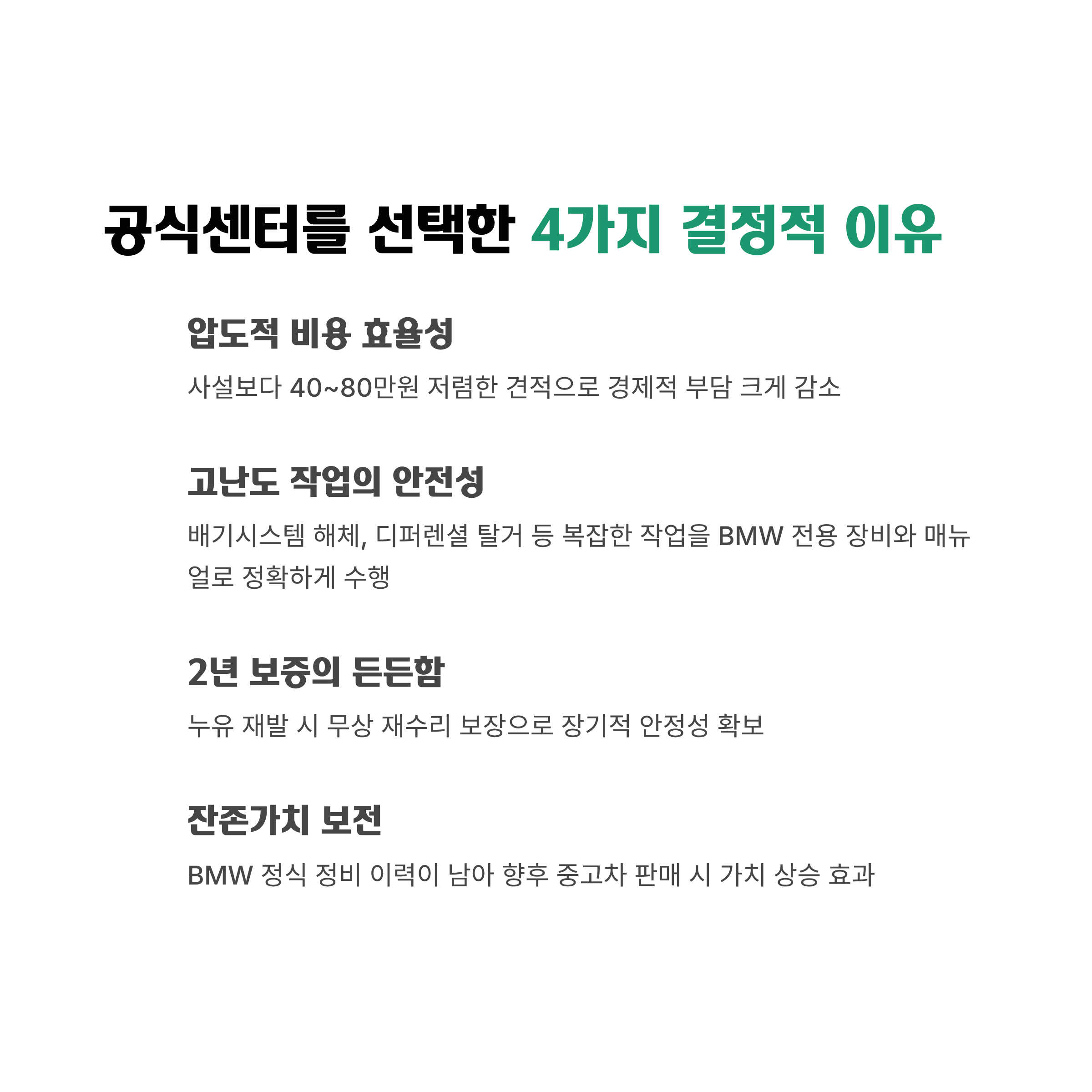 BMW 정식 이력에 남아 나중에 중고차 팔 때도 플러스 요소가 됩니다.